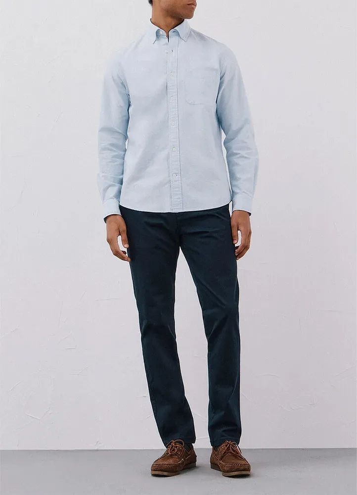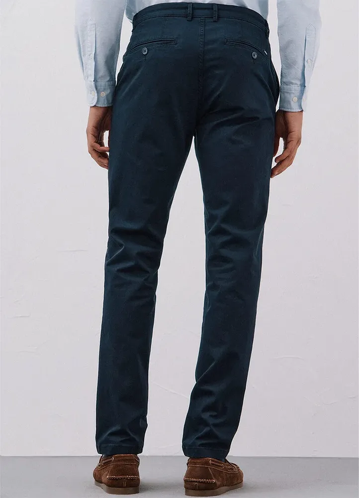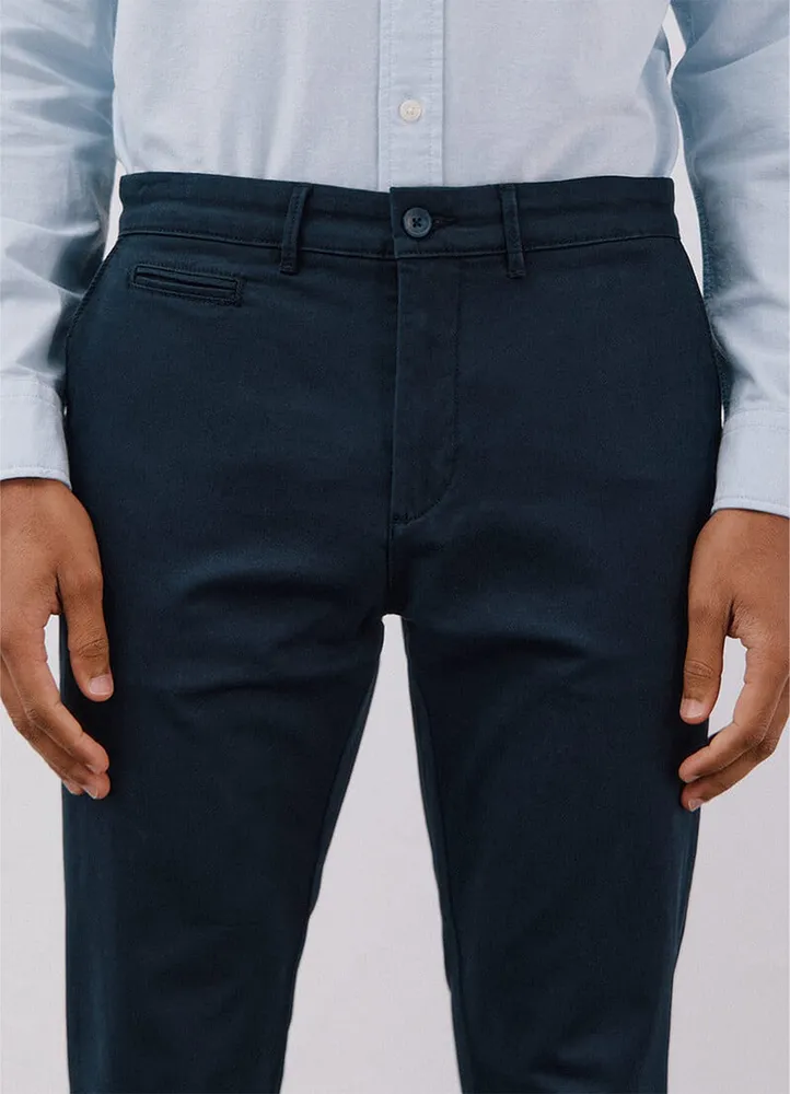 Slim fit chino pants featuring a button and zipper closure, and include elastane for enhanced comfort and flexibility.