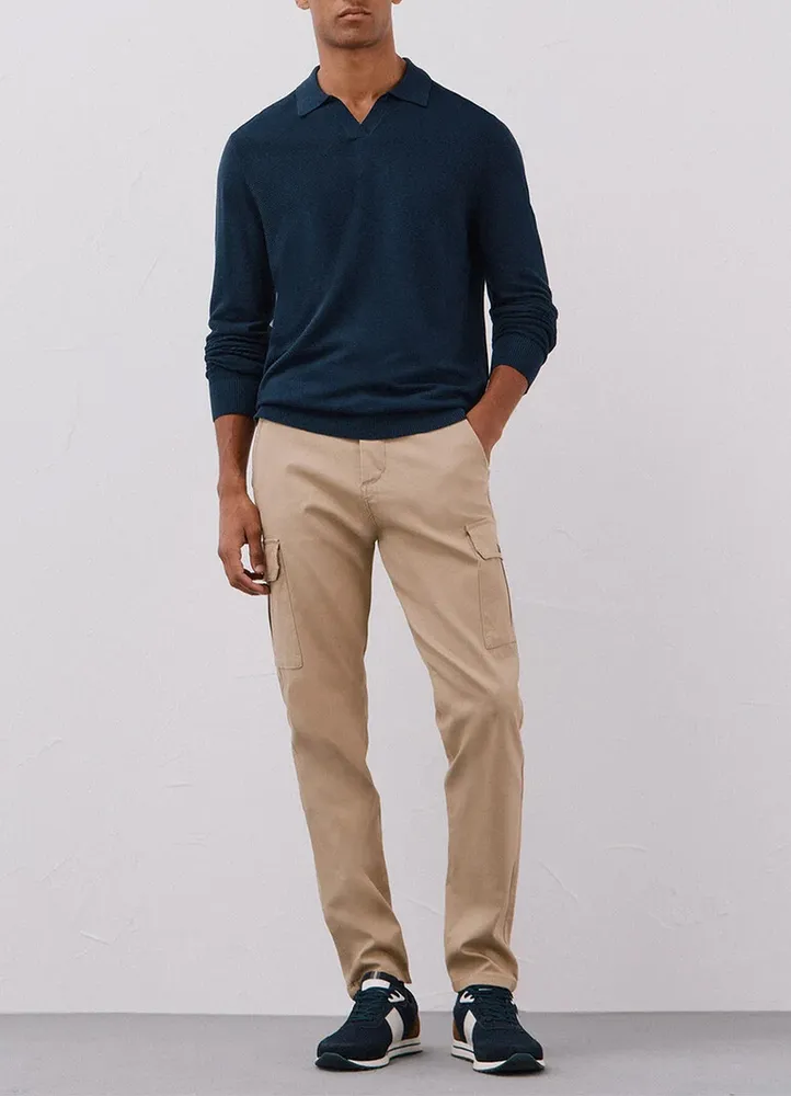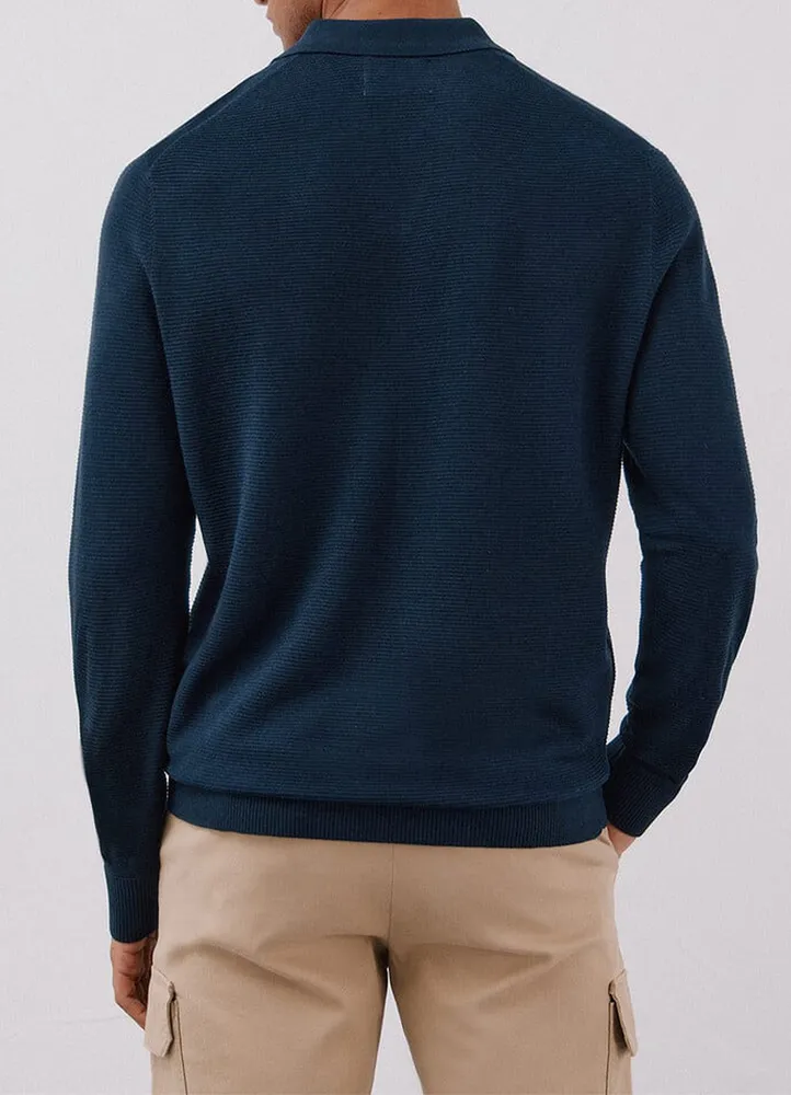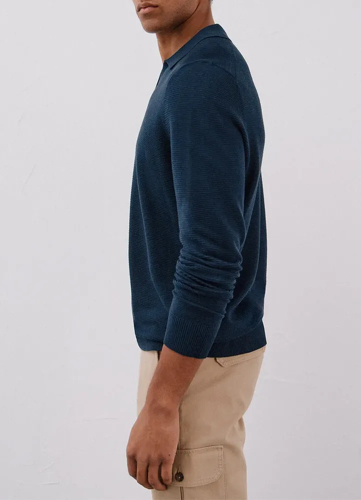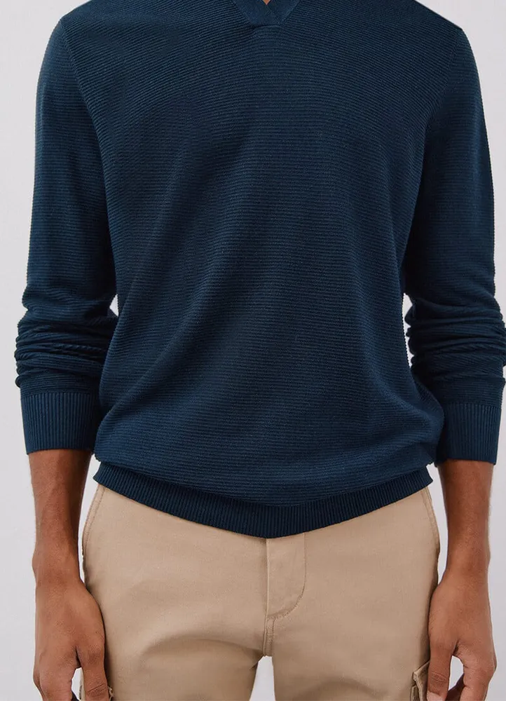 Long sleeve, V-neck, regular fit, structured, knitted polo neck sweater without buttons, featuring a horizontal structure and ribbed finishes.