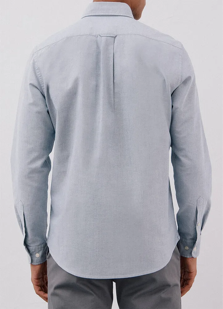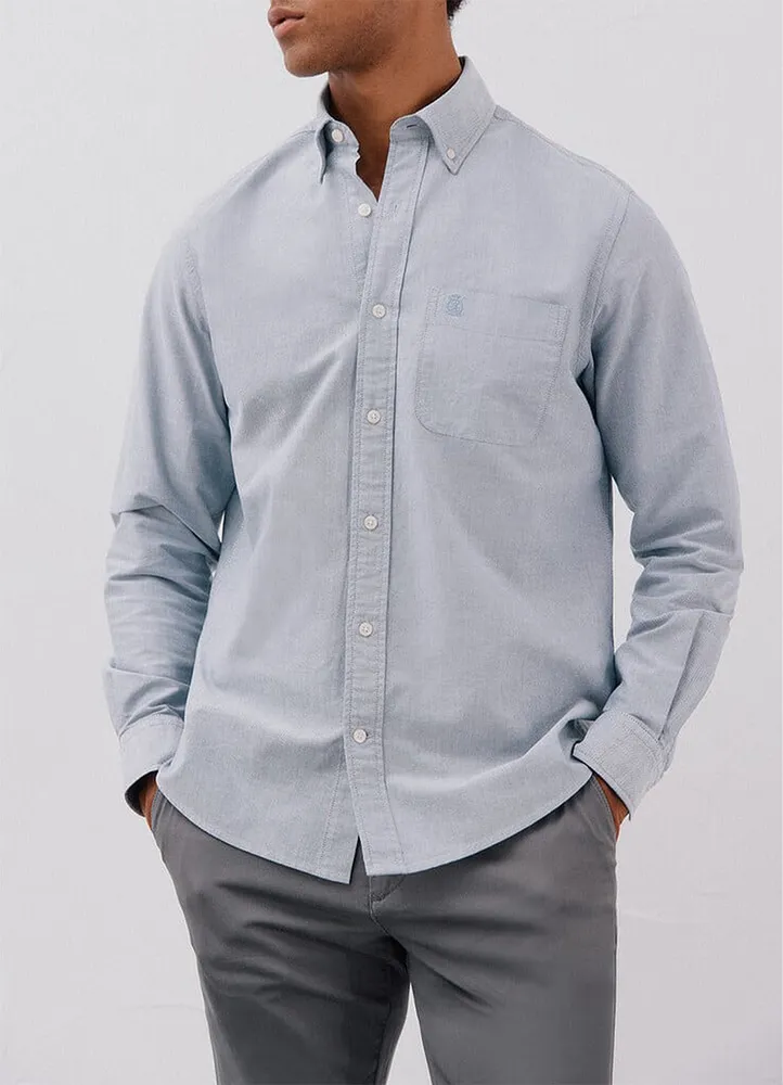 Long sleeve, regular fit, plain, Oxford shirt featuring a buttoned collar, and a chest pocket with an embroidered logo.