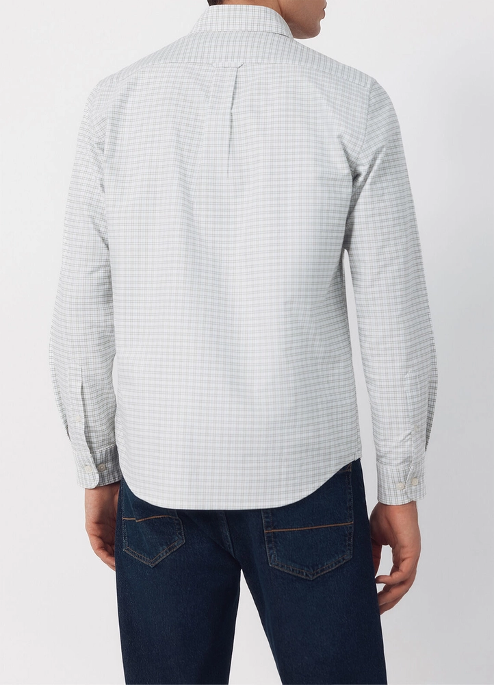 Long sleeve, regular-fit shirt is crafted from 100% cotton plaid oxford fabric washed for softness, featuring a buttoned collar and a chest pocket with an embroidered logo.