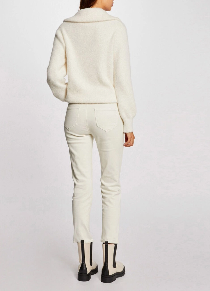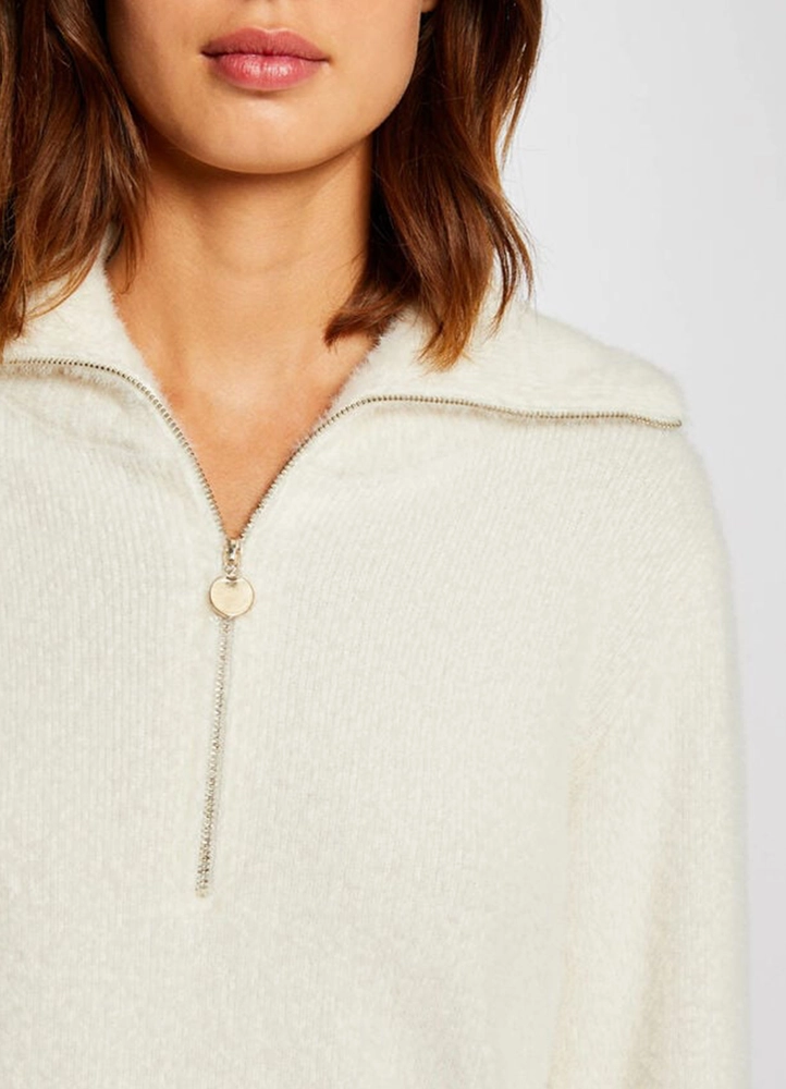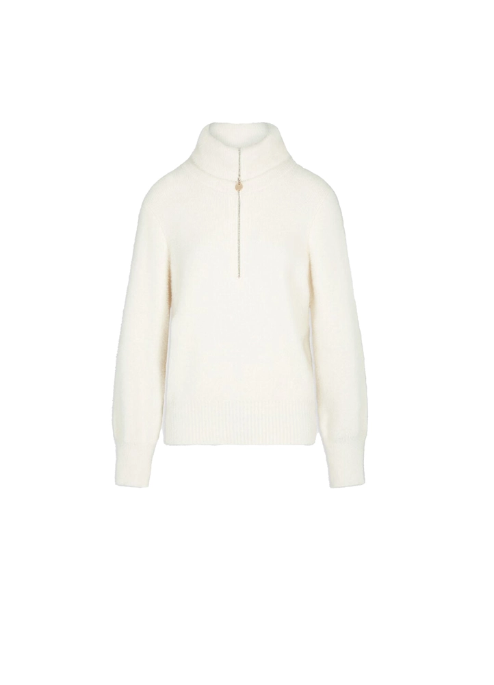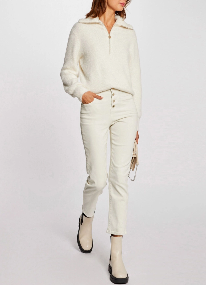 This straight-cut jumper features a versatile lapel collar with a zipped neckline for adjustable style. Crafted in a medium, fluffy knit with subtle ribbed detailing, it offers both comfort and texture, making it a cozy yet stylish wardrobe essential.