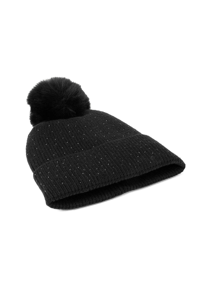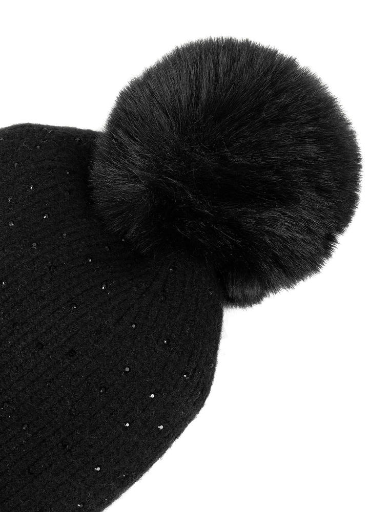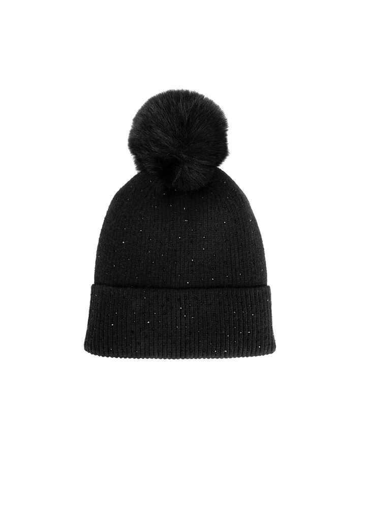 This fine ribbed knit beanie features sparkling rhinestone details for a touch of feminine elegance. Topped with a soft faux fur pom-pom, it brings warmth and style to any winter look.