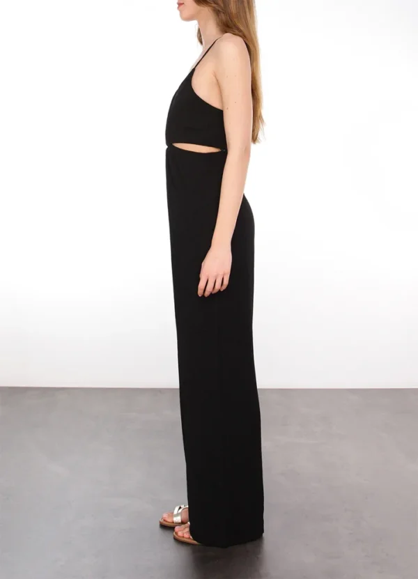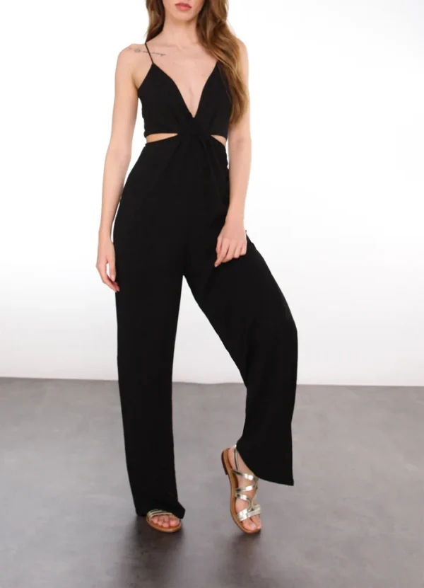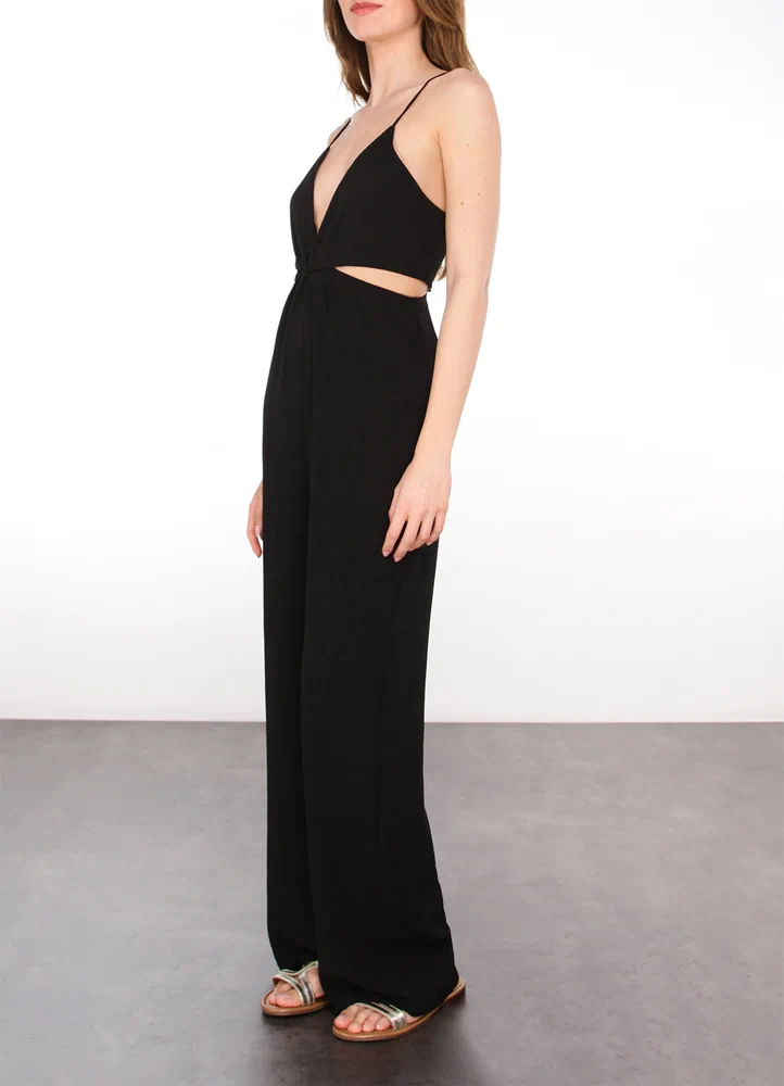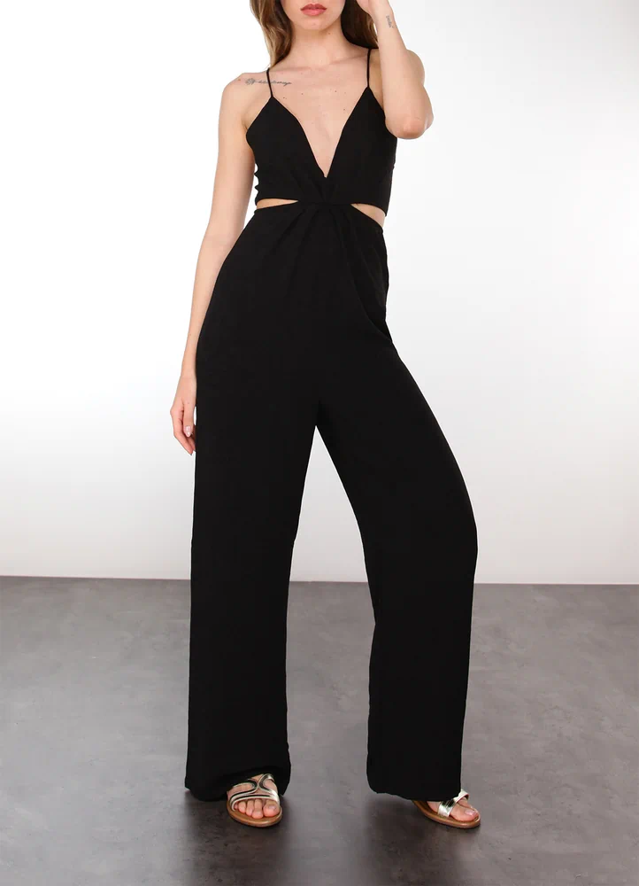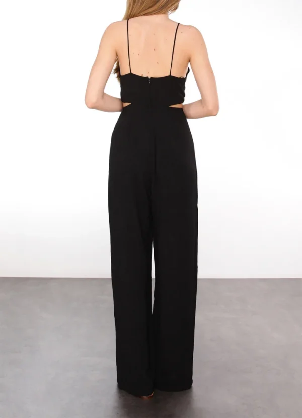 Jumpsuit in v-neckline featuring thin straps, side cut outs, front pockets, wide legs and in-seam back zip fastening.