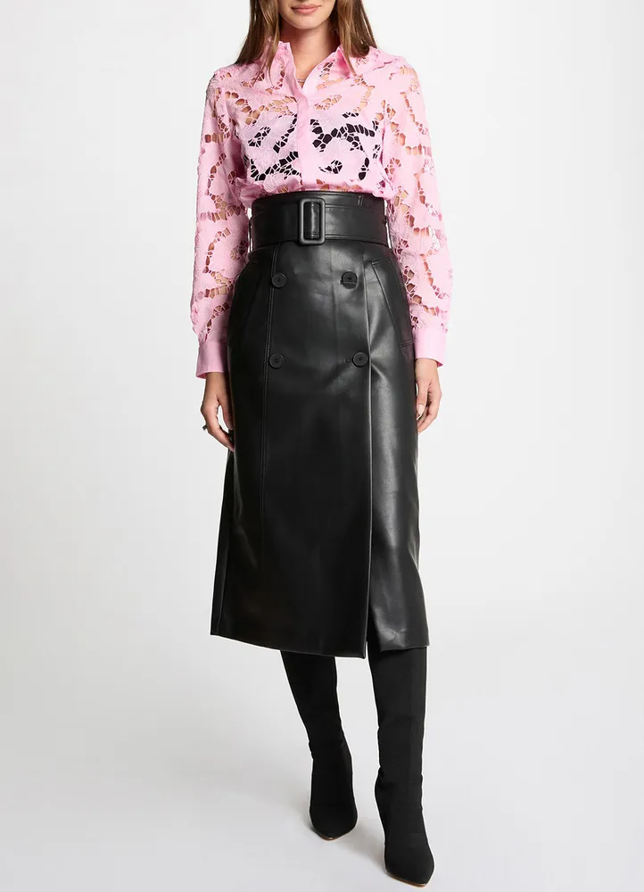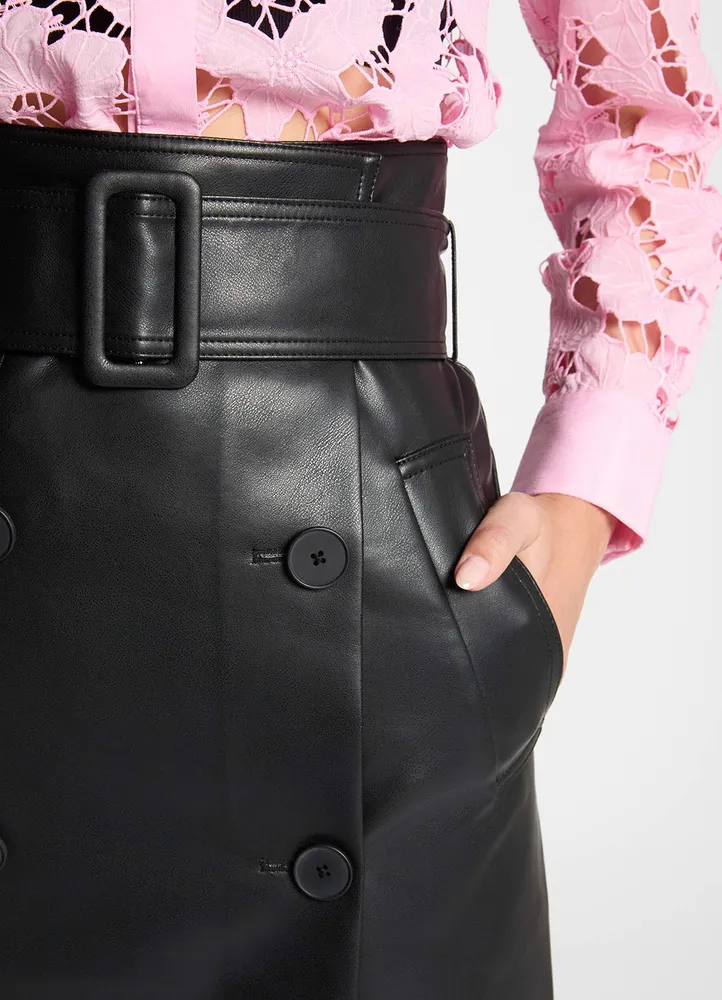 This long faux leather skirt features a high waist and a stylish wrap cut with a front button fastening. Belt loops and a tone-on-tone belt with buckle complete the look, while two welt pockets at the front and two at the back add functional style. Perfect for creating edgy yet sophisticated outfits.