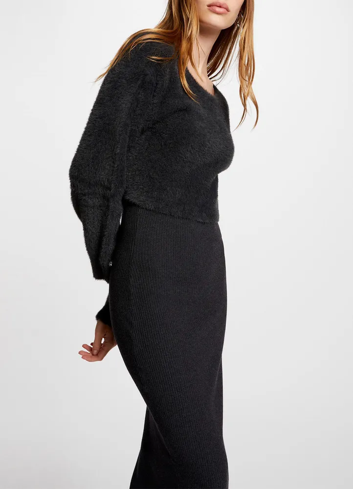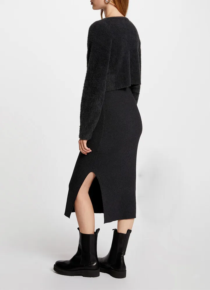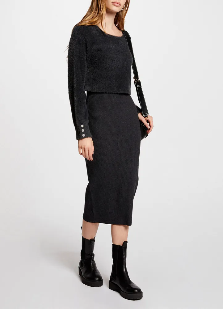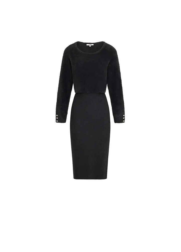 Chic and cozy with a clever twist, this midi dress creates the illusion of a two-piece outfit thanks to its 2-in-1 jumper and skirt design. The fitted cut flatters the figure, while the ribbed knit lower part contrasts beautifully with the fluffy knit texture on the chest. It features a classic round neckline, long sleeves with decorative buttons at the cuffs, and a side slit for added movement and ease. A modern and versatile piece, perfect for both day and evening wear.