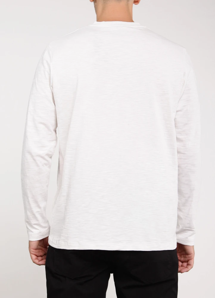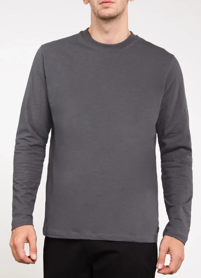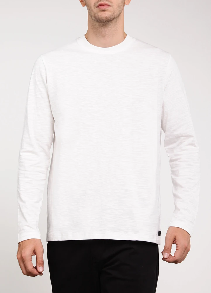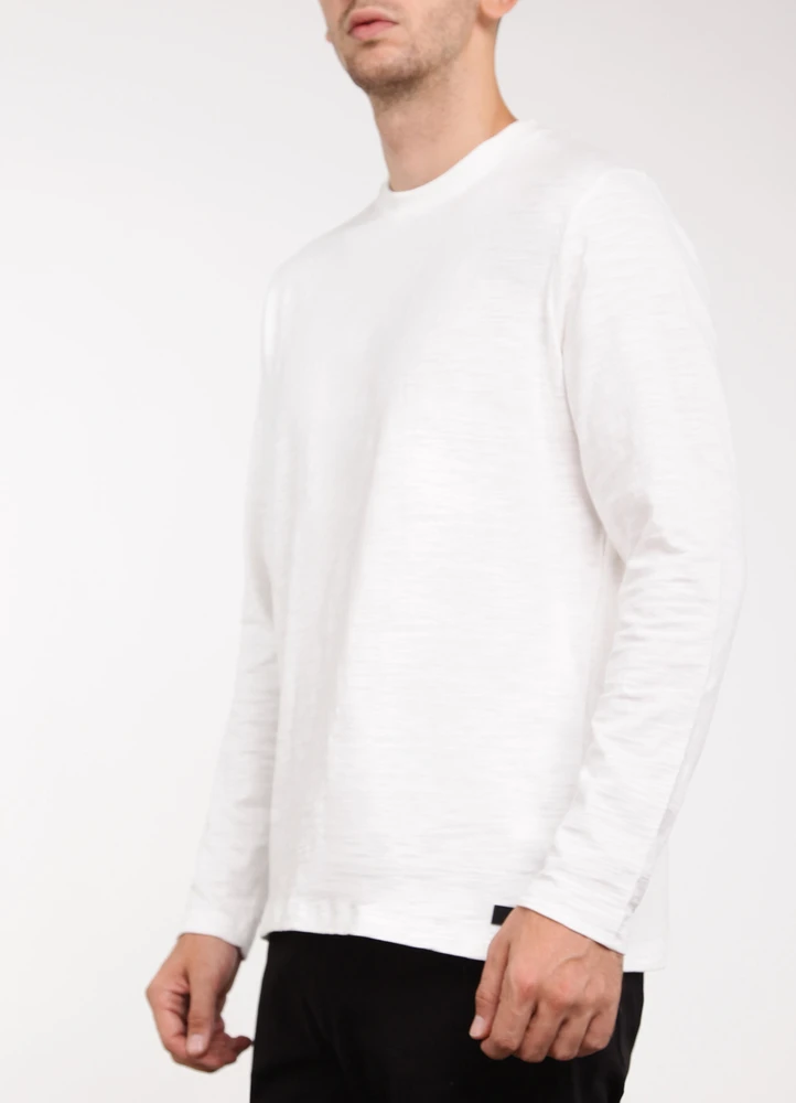 Plain straight bottom long sleeve t-shirt featuring ribbed collar and Maison Brown rectangular rubber badge on bottom.