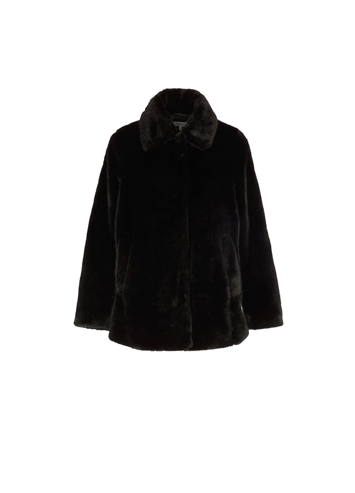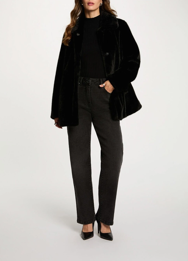 A modern, feminine coat featuring a straight cut that enhances the silhouette with elegance. Faux fur details add a sophisticated touch, highlighting each element with subtle refinement. Its balanced length creates a harmonious look, blending contemporary style with timeless glamour.