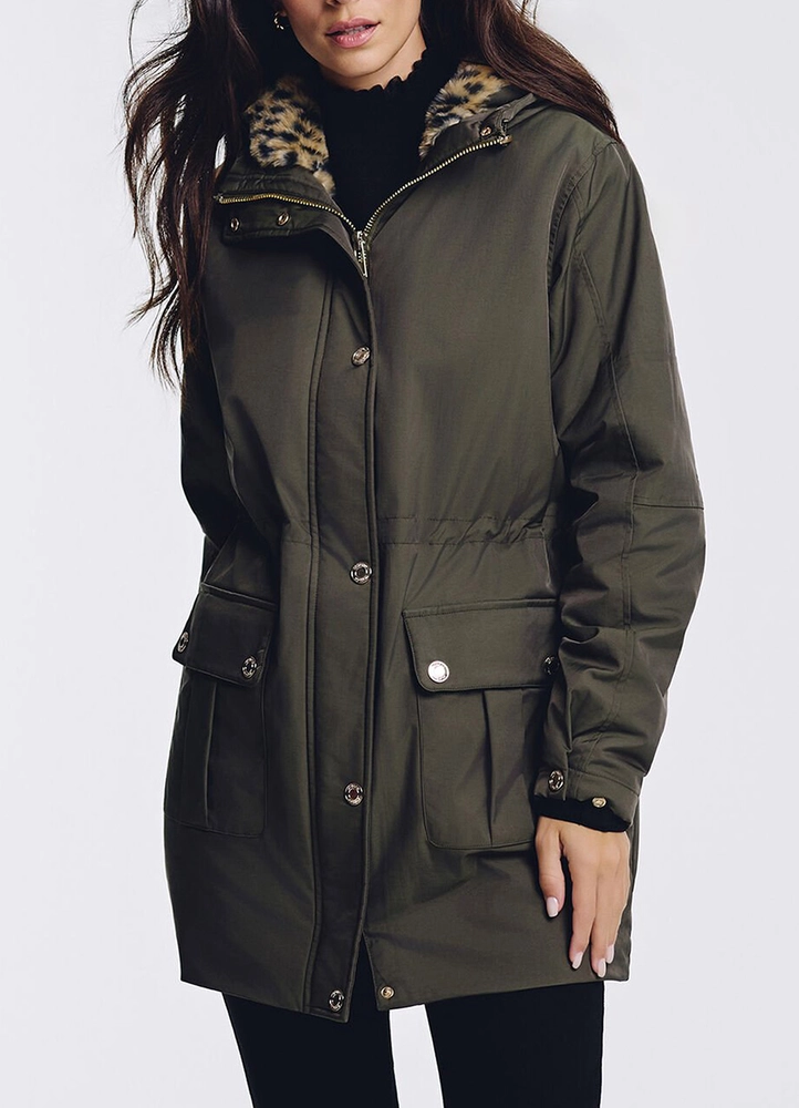 This long, straight parka elegantly elongates the silhouette. Faux fur detailing adds a feminine, trendy touch, perfect for a casual-chic look. A drawstring subtly defines the waist, while zip fastening and buttons give the jacket a modern, structured finish.