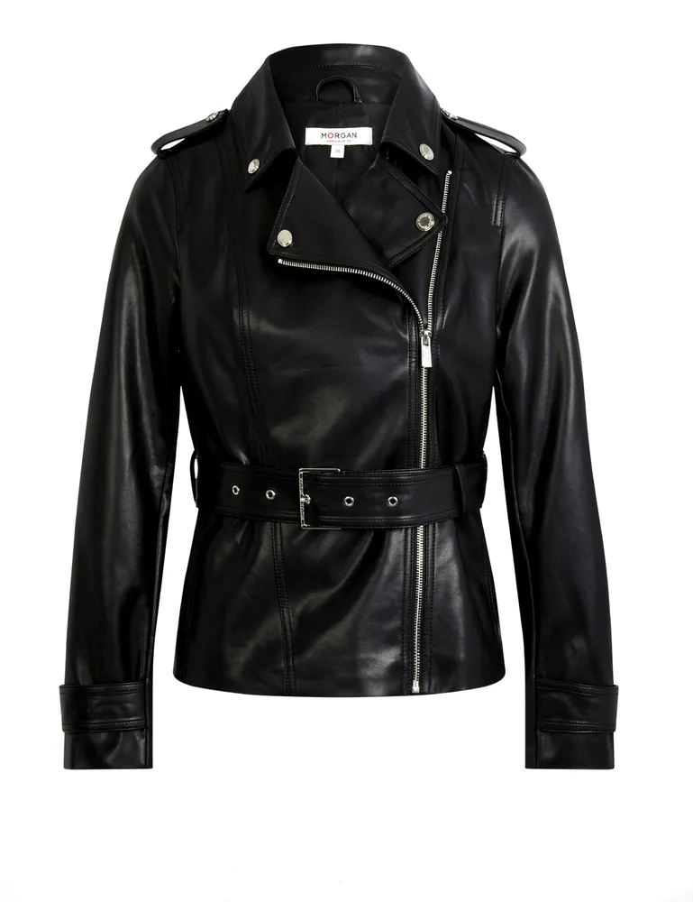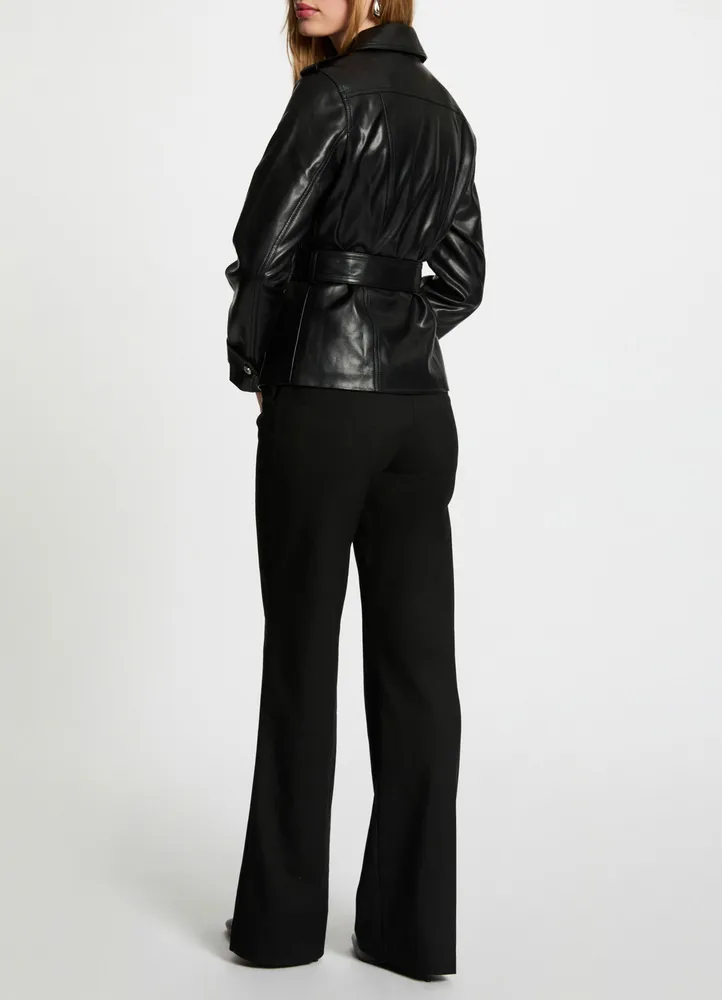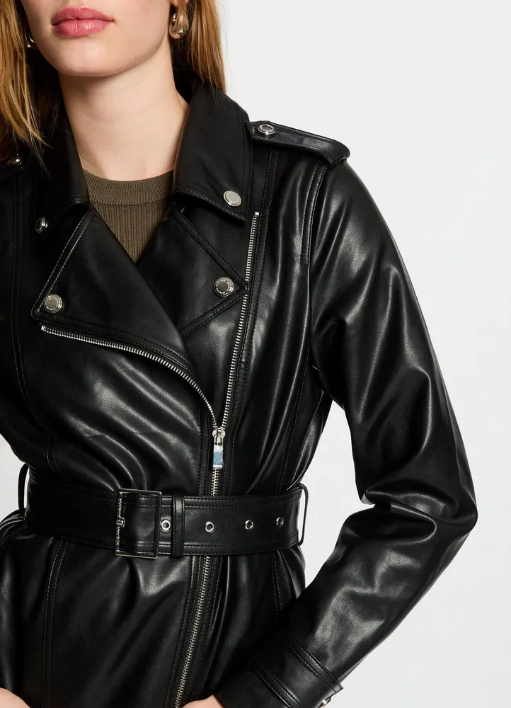 | Faux leather jacket Straight cut Short length Notched lapel collar Long sleeves Front zip fastening Faux leather effect Belt loops Tone-on-tone belt with buckle Buttoned tabs on the shoulders and cuffs Materials: Main fabric: 100% Synthetic (Polyurethane) Lining: 100% Polyester |