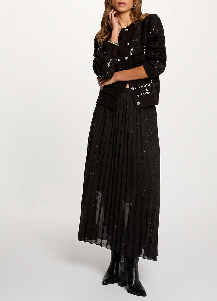 A graceful skirt featuring delicate pleats that move elegantly with every step. Rhinestone details add a luminous, sophisticated touch, ideal for a refined style. Its straight cut flatters all body shapes while subtly elongating the legs.