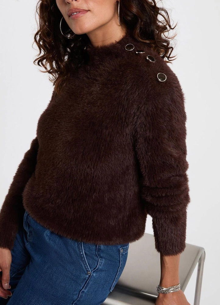 This cropped, fitted sweater flatters the figure with a modern, feminine touch. Crafted in a soft, fluffy knit, it exudes chic elegance, while delicately placed buttons add refined detail for a sophisticated everyday look.