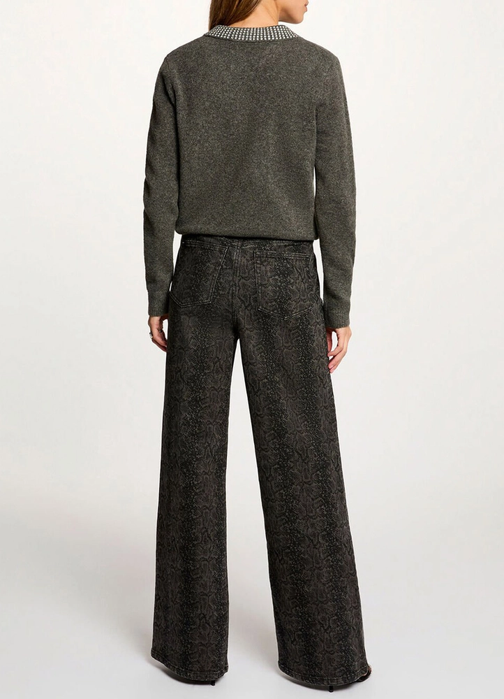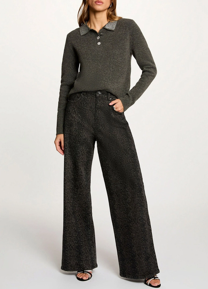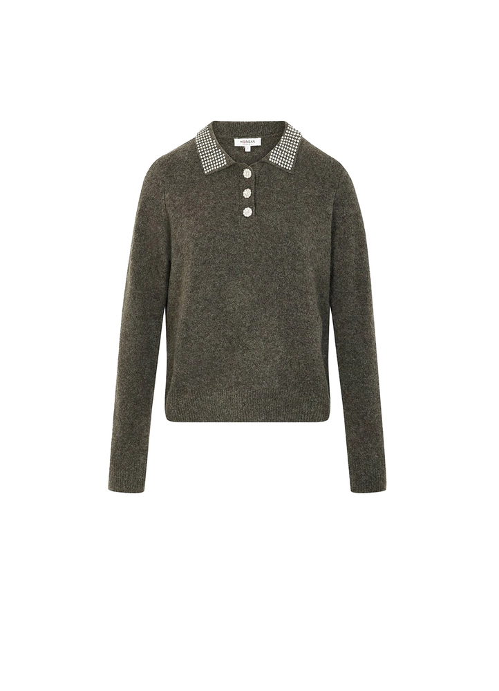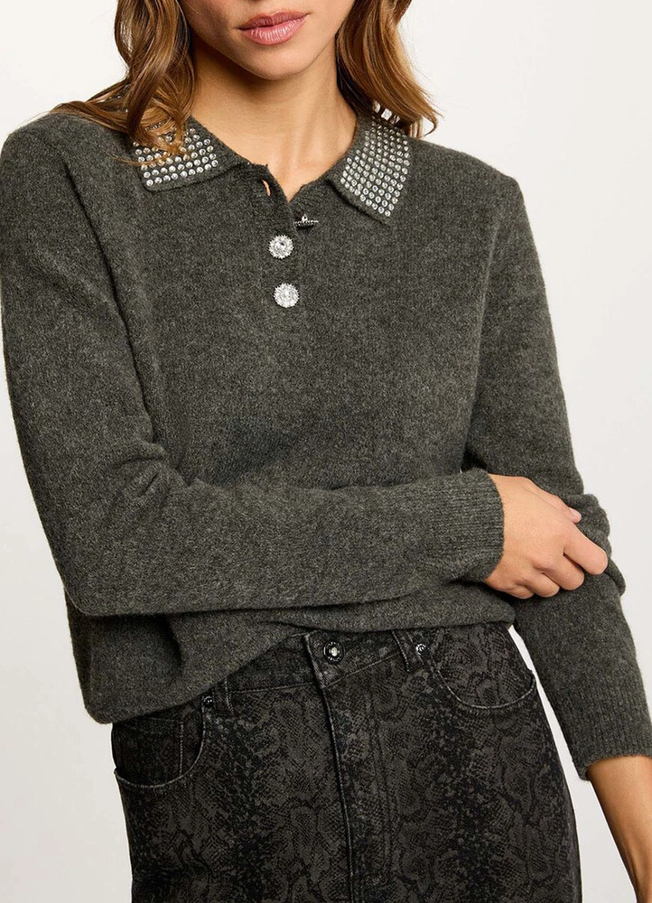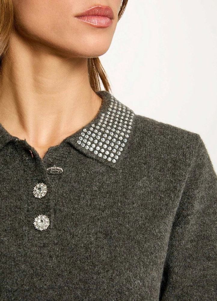 A refined sweater featuring a modern lapel collar that adds a sophisticated touch to the silhouette. Its fitted cut gently highlights the curves for a distinctly feminine look. Jewelled buttons bring a luminous, precious detail that elevates this essential piece of the contemporary wardrobe.