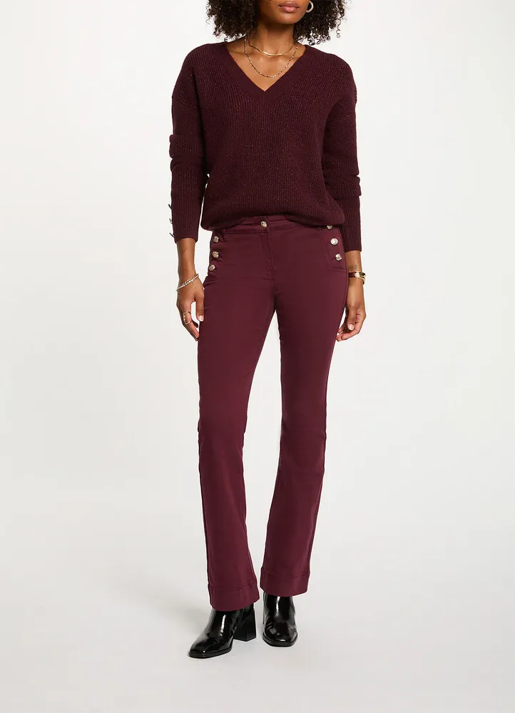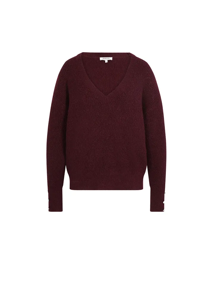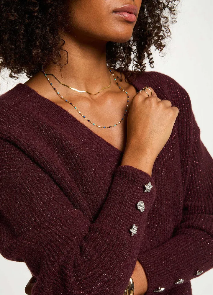 This oversized jumper features a relaxed V-neck and long sleeves in a medium knit. Subtle metallic thread details add a touch of sparkle, making it a cozy yet stylish statement piece.