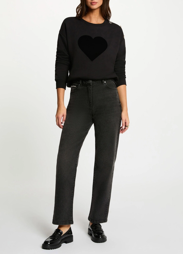 This straight-cut sweatshirt flatters all body shapes, creating a balanced, feminine silhouette. A trendy print adds modern flair, while button details bring a chic, sophisticated touch to casual style. Effortlessly combining elegance and comfort, it’s a versatile wardrobe essential.