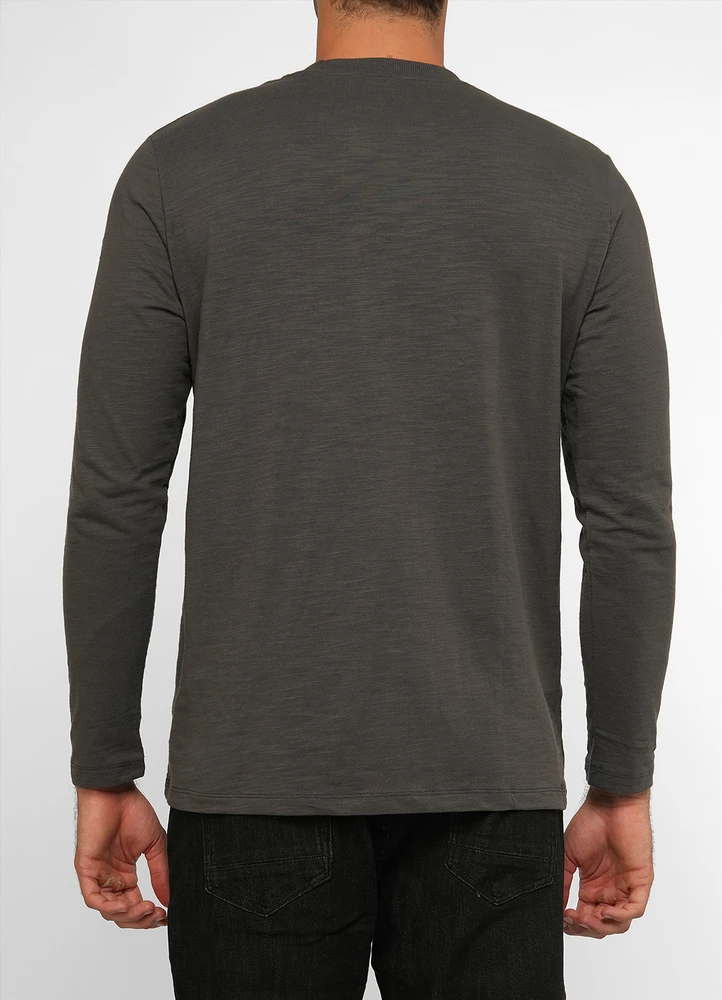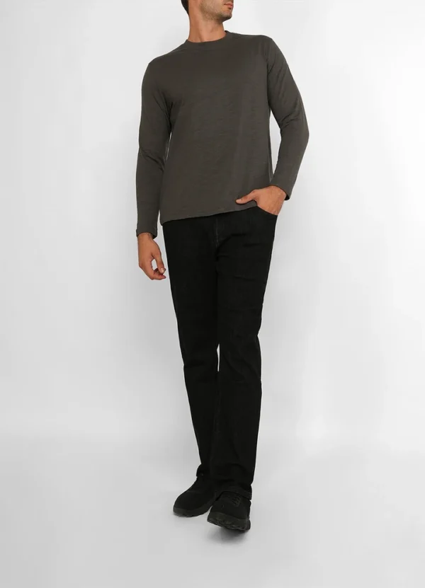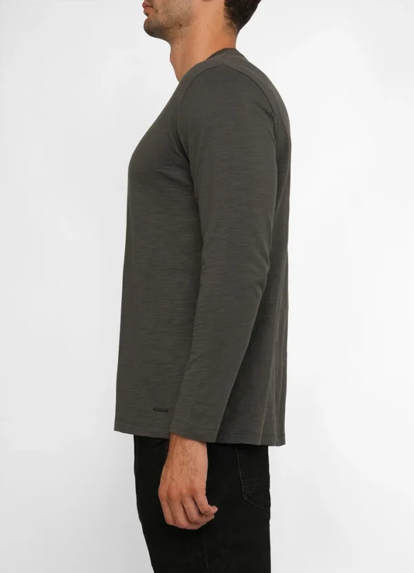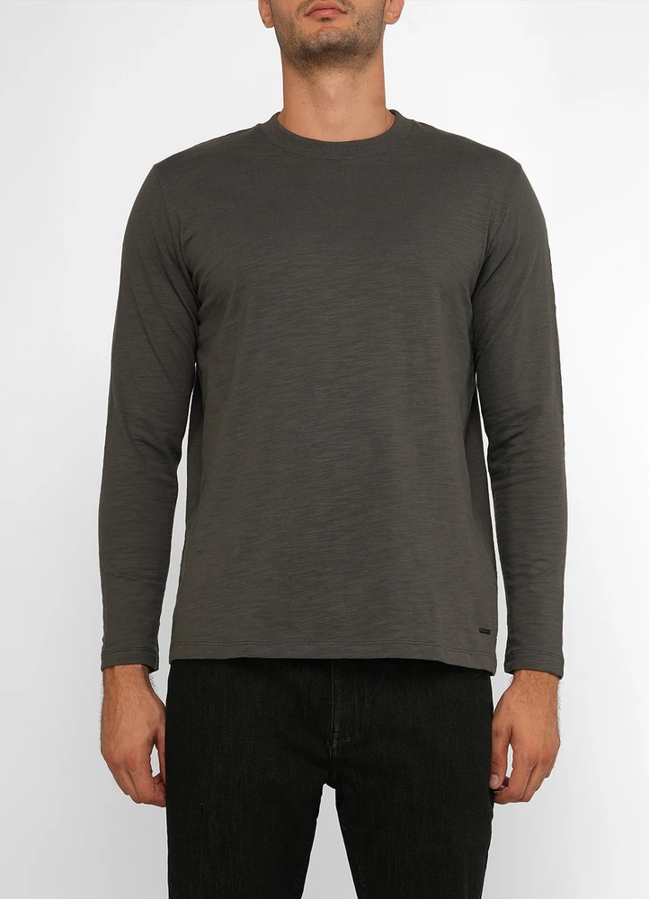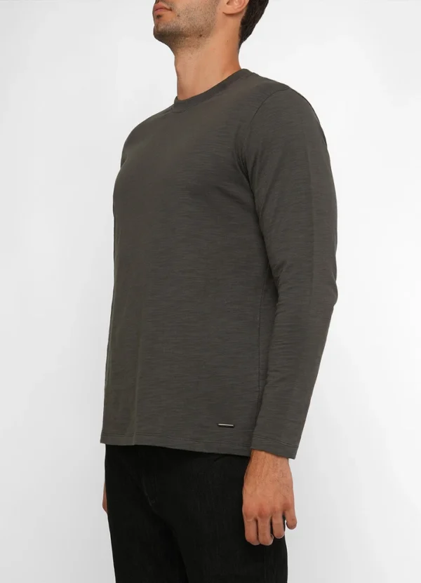 Slub plain straight bottom crew neck t-shirt with ribbed collar and Maison Brown metal branding on bottom.