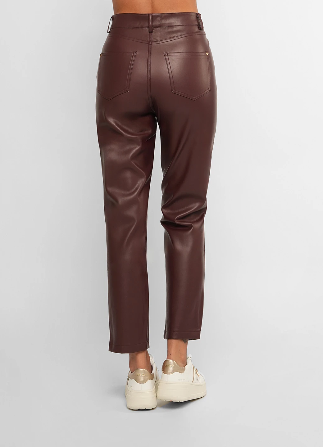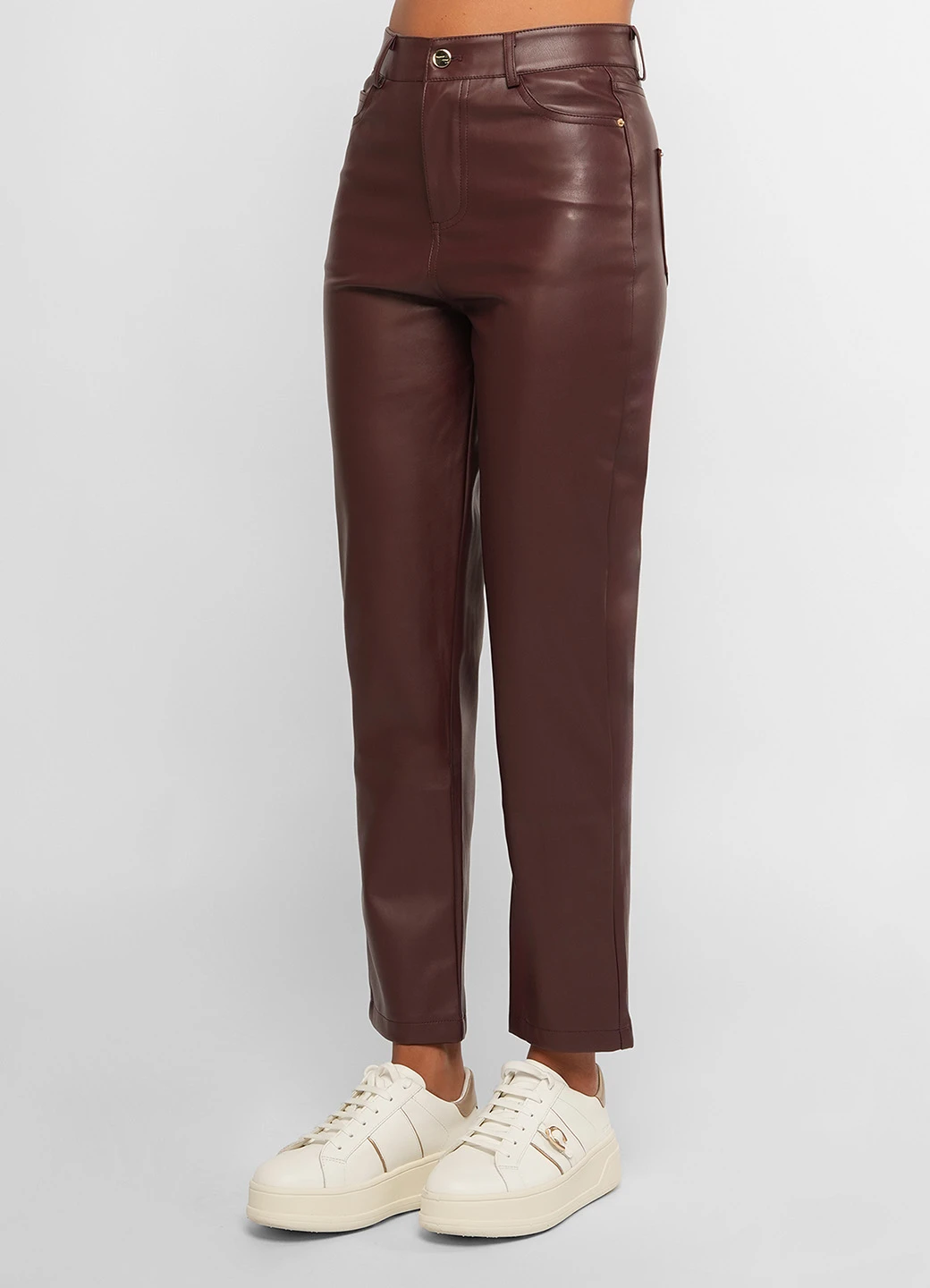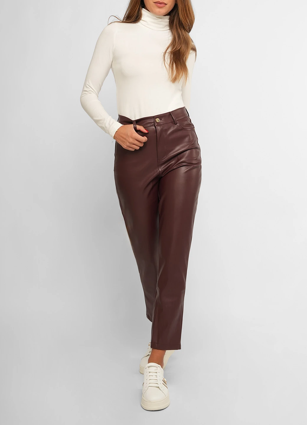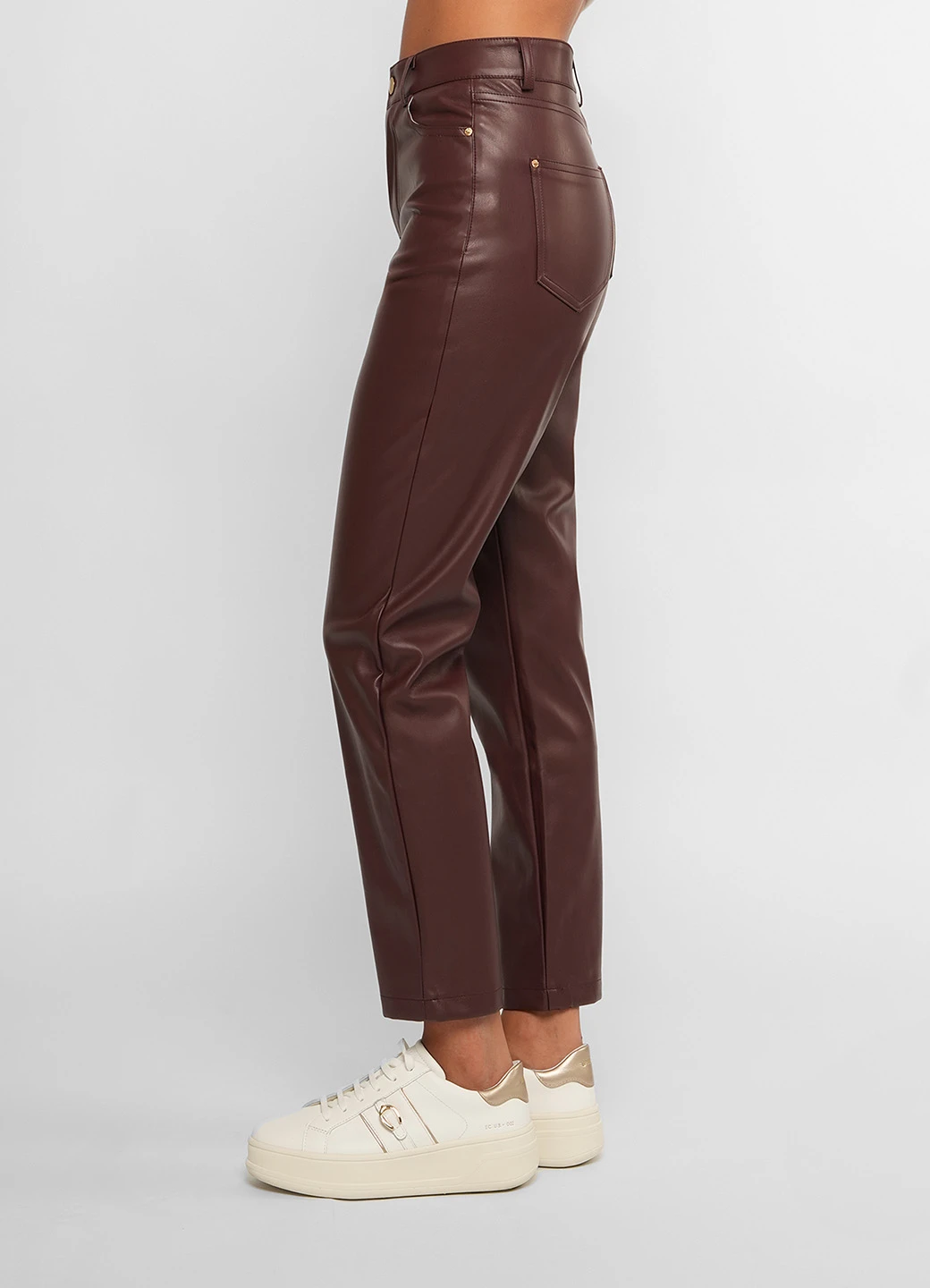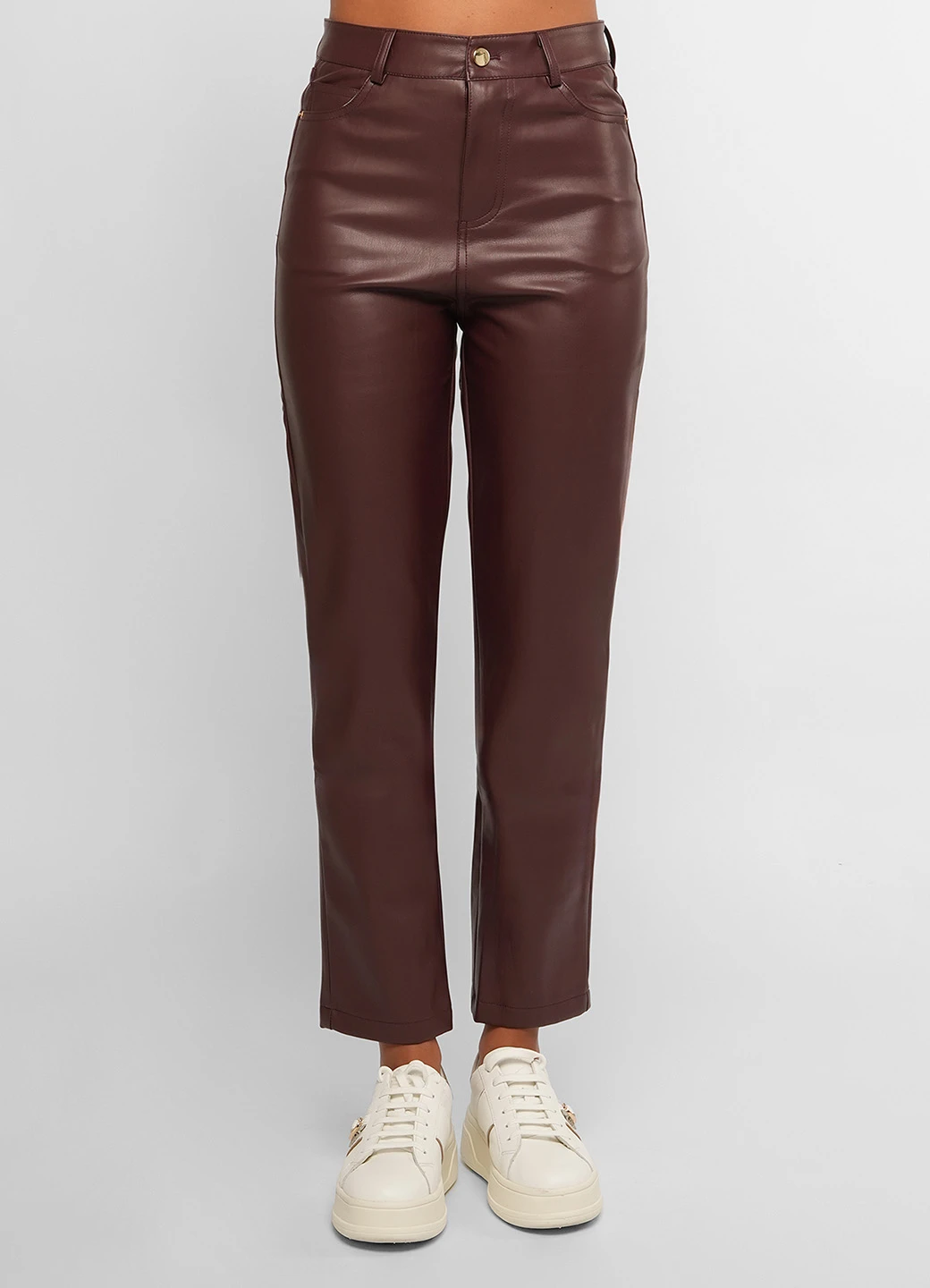 High-waist, straight leg, 5 pockets PU pants featuring zip fly and button fastening at the front.