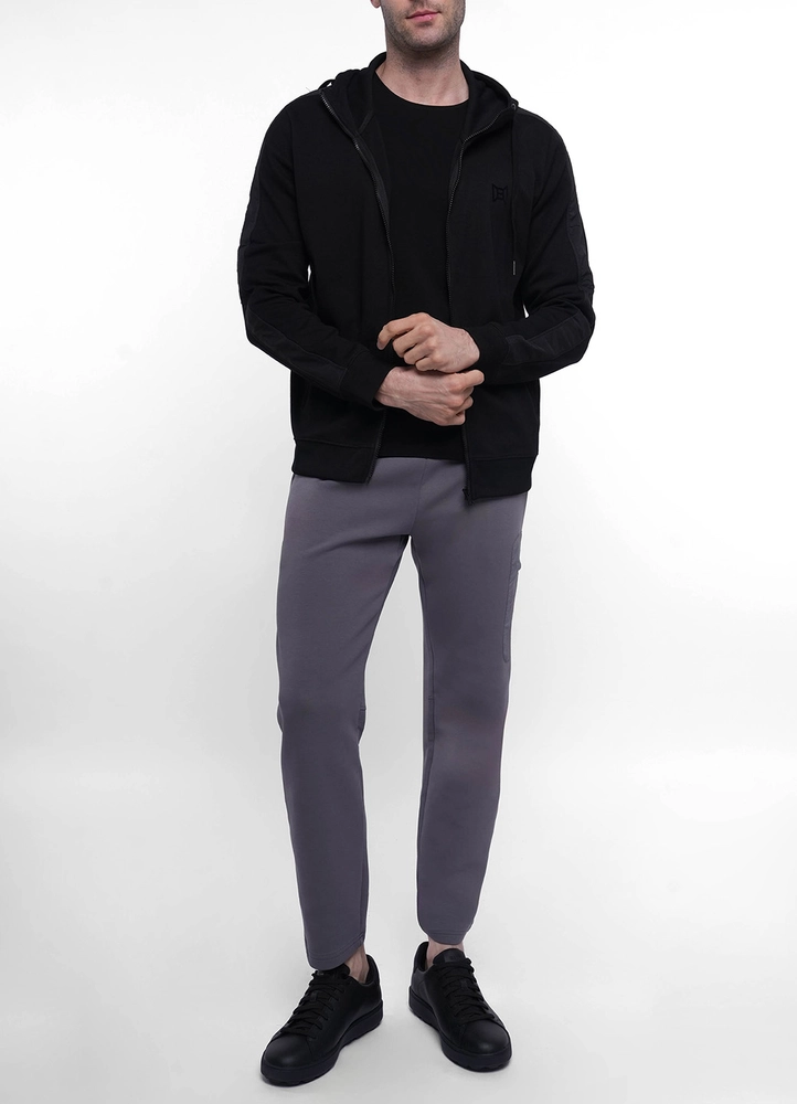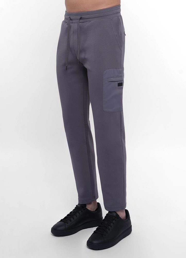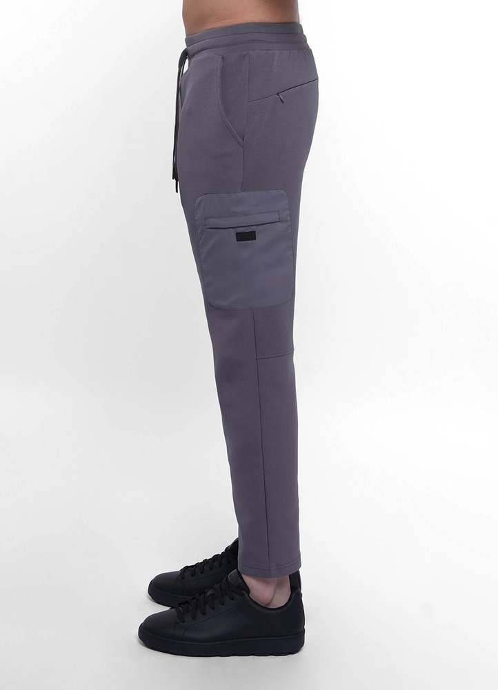 Cuffed cotton mix sweat pants with one nylon cargo pocket and back invisible pockets.