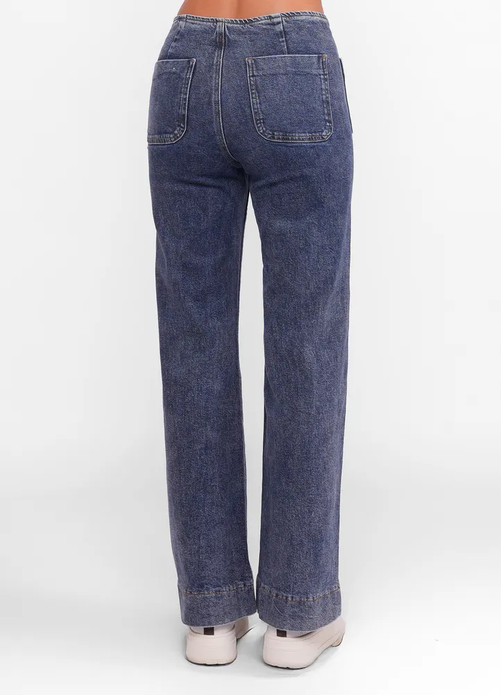 Wide leg jeans with faded effect & braided details at waist.