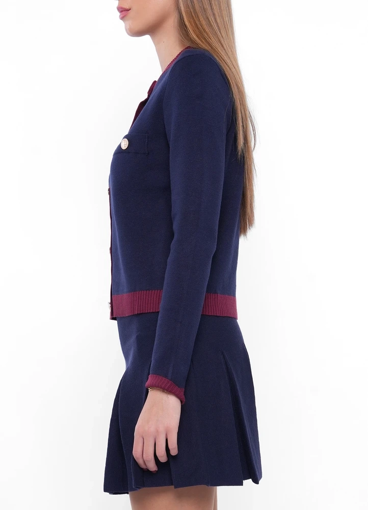 Knitwear Cardigan with contrast lining and 2 pockets on chest and gold buttons.