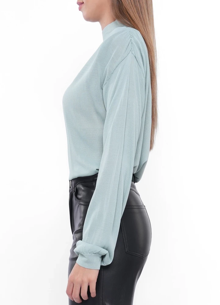 JD143- LS mock neck blouse with cuffs and back fastening with matching buttons.