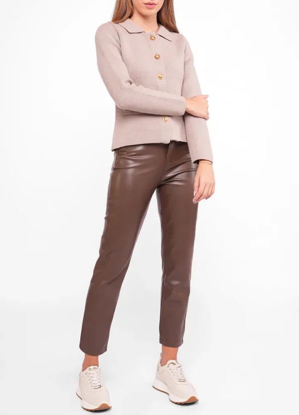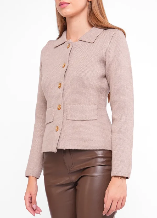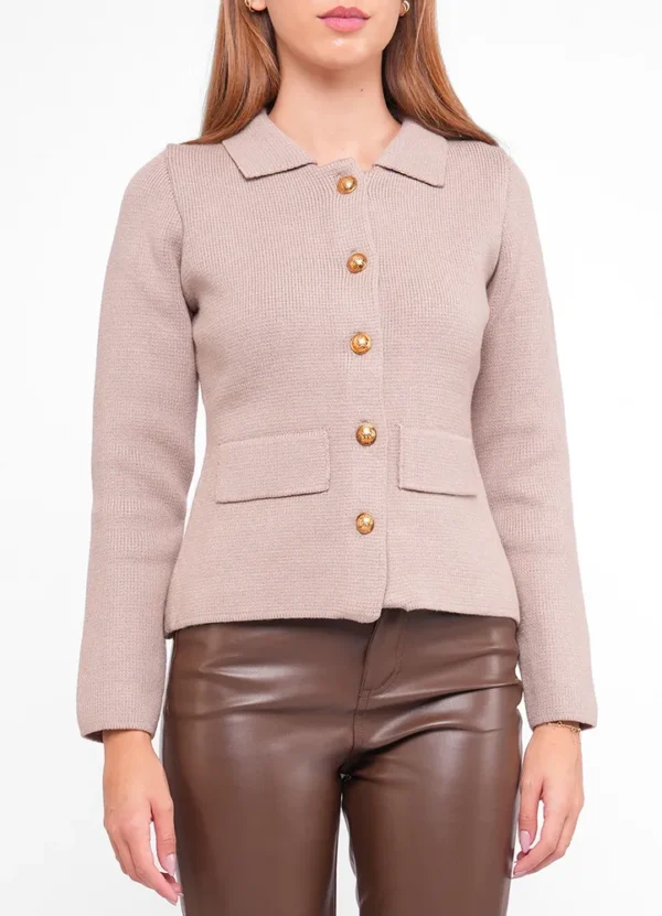 Knitted buttoned cardigan with double welt pockets on bottom and collar with embossed gold buttons