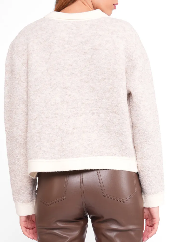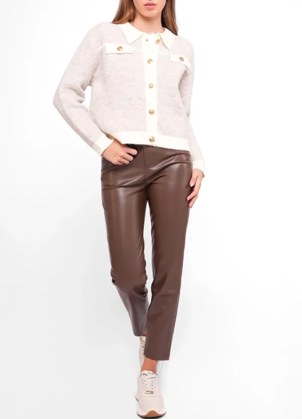 Knitted buttoned cardigan with double welt pockets on chest and collar with embossed gold buttons