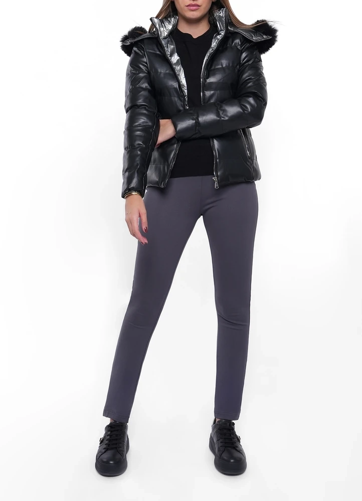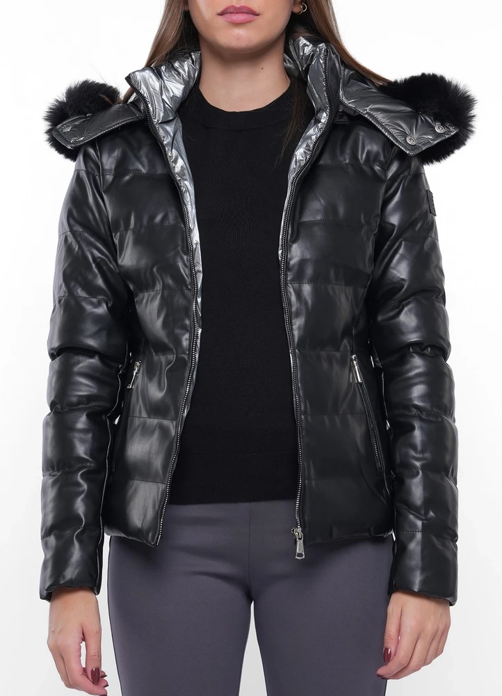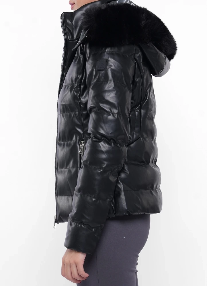 JD147- PU Short quilted jacket with fur hood with full zip and zipper side pockets with MB rubber badge on the left arm.