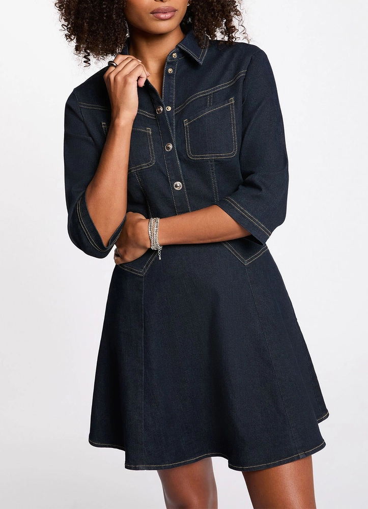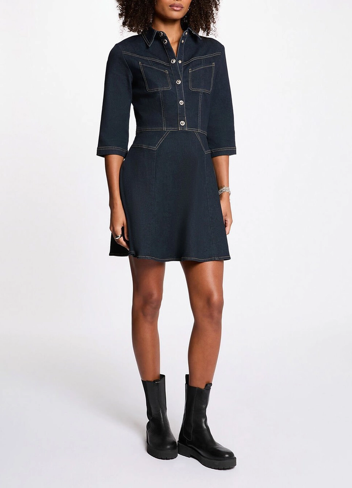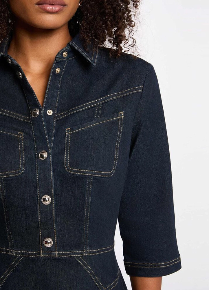 This fitted, knee-length denim dress enhances the silhouette with natural elegance. Designed with a structured lapel collar, it brings a modern yet feminine touch, while the button detailing adds a subtle statement to its refined design. Elbow-length sleeves and a zip fastening ensure both comfort and practicality, making it a timeless and chic piece with effortless style.