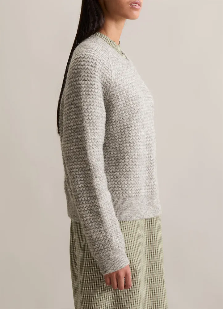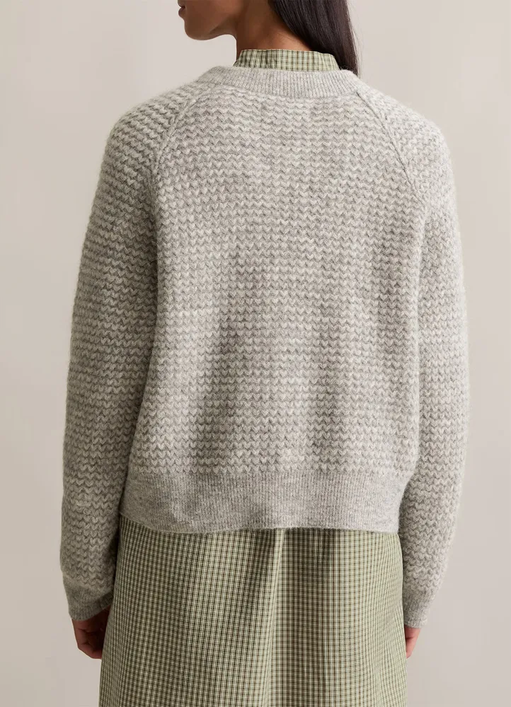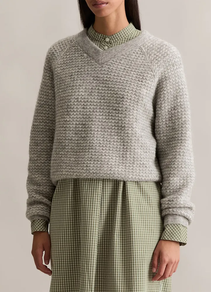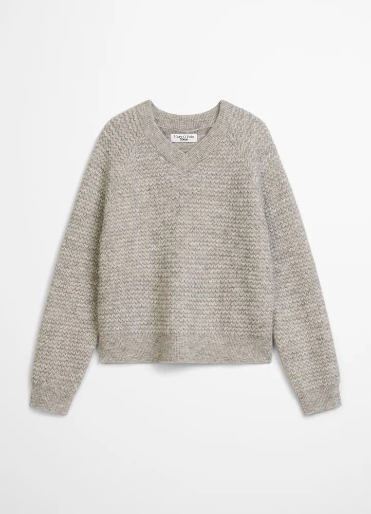 Soft and warm with texture — this Marc O’Polo DENIM V‑neck is knitted from a luxurious blend of virgin wool, alpaca, and polyamide, designed to layer beautifully through the cooler seasons. It features a relaxed, cropped silhouette, a deep ribbed V‑neckline, sporty raglan sleeves, and classic ribbed cuffs and hem — all with a bold zigzag texture.