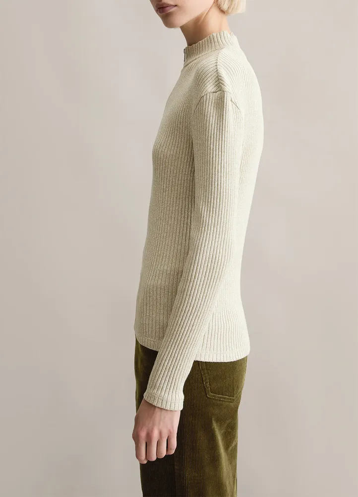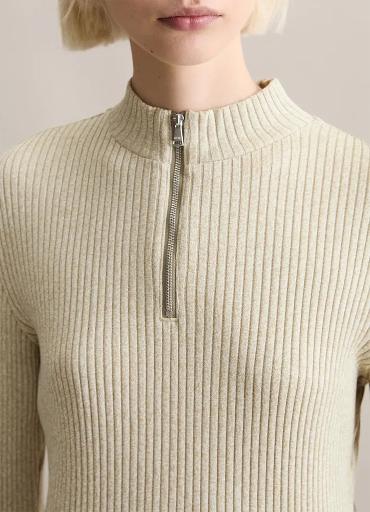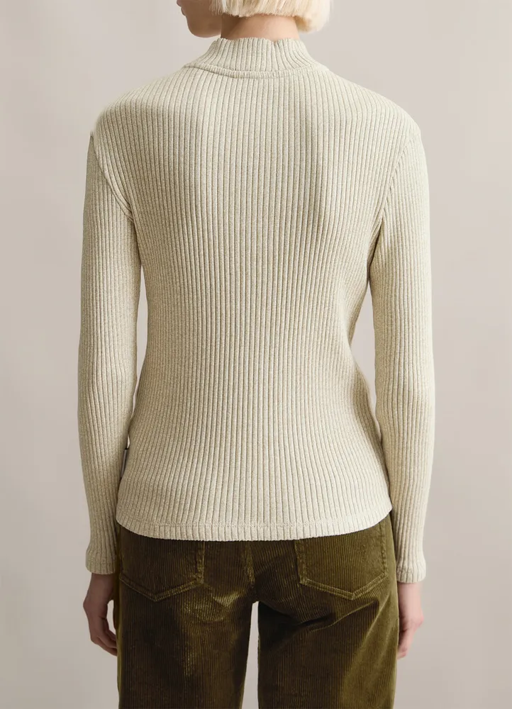 A sleek and versatile layering piece — this Marc O’Polo DENIM half-zip long sleeve is crafted from soft, ribbed jersey in a rich gray hue. Designed in a slim, feminine fit, it features a high stand-up collar with a half-length metal zipper and long, narrow sleeves. The fine ribbed texture adds subtle depth, making it a stylish alternative to traditional sweaters or blouses. Perfect for pairing under blazers or with jeans for a polished yet relaxed look.