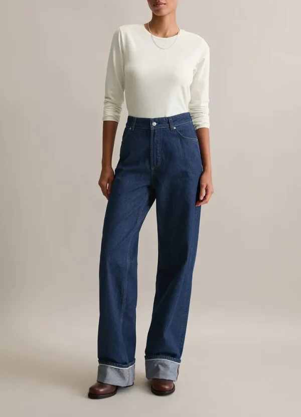 Bringing variety to the everyday life of jeans wearers: the Tomma wide model from Marc O’Polo DENIM with a high waist and straight-cut, wide and slightly flared legs in a regular length and wide turn-up. The new trouser style exists alongside the beloved skinny jeans and is now the second most popular jeans model. Casual five-pocket style made from high-quality, pure organic cotton, non-stretch – with no added elastane, in a classic and authentic dark blue rinse-wash quality. With the characteristic tobacco-colored seams. Styling tip: pair with a short knitted sweater. Our aim is to produce our most sustainable jeans. From the raw materials to the dyeing and washing processes. Follow our journey to more responsible production. It’s on us.