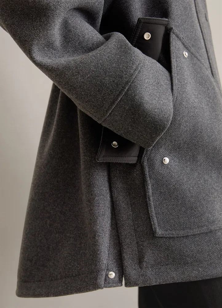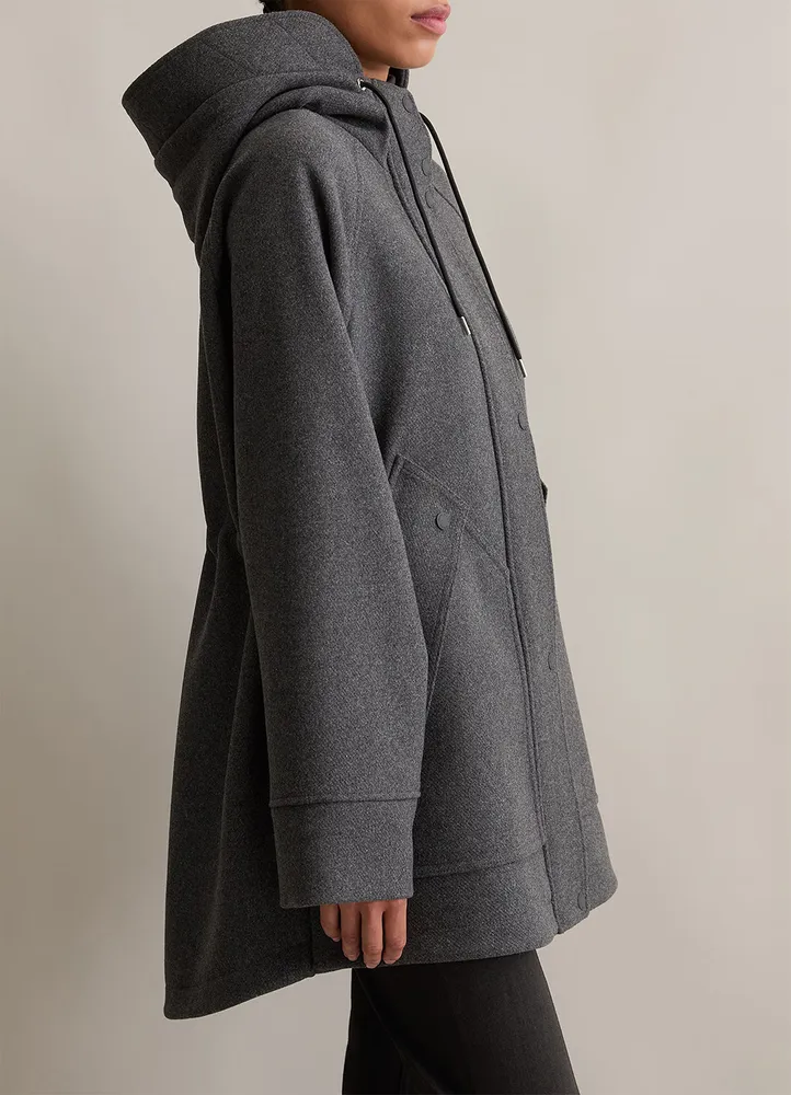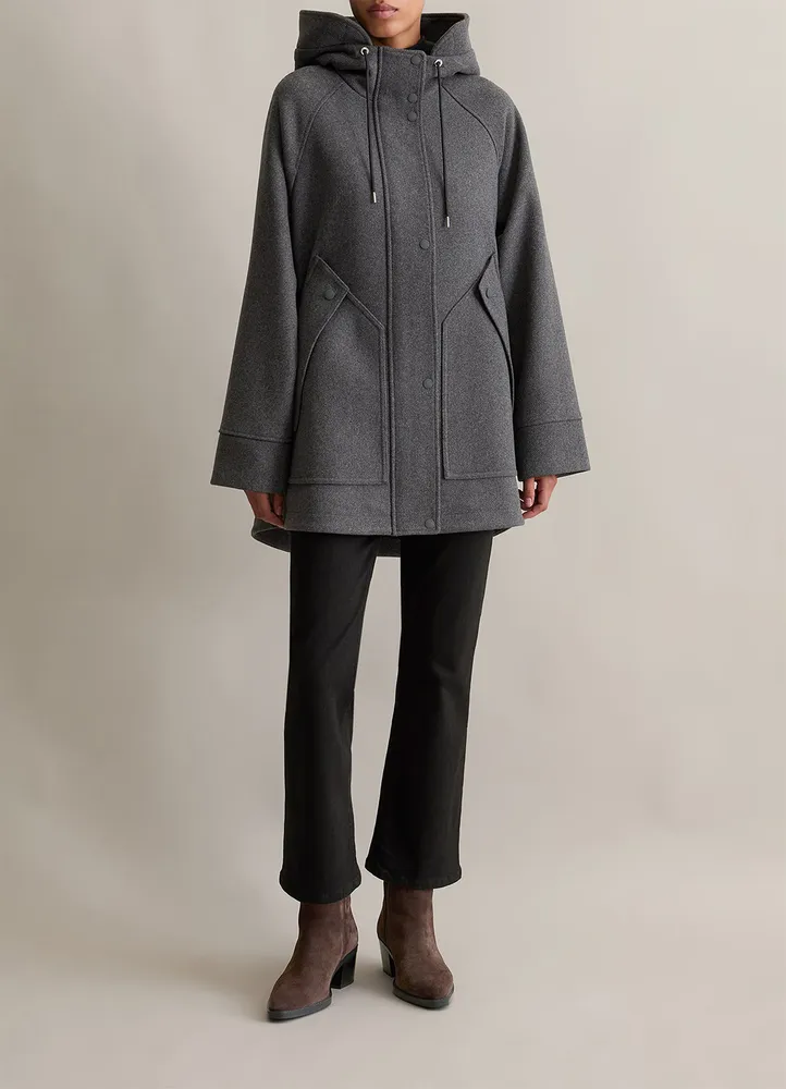 A modern take on a timeless classic — this Marc O’Polo DENIM wool parka is crafted with recycled wool and designed for both style and practicality. Featuring sporty raglan sleeves, an adjustable hood, and large patch flap pockets, it’s finished with a robust front zipper, storm flap, and press stud fastener. Slanted side seams and a drawstring waist add shape and versatility to the silhouette. Fully lined for comfort and warmth, it’s the ideal layering piece for cooler seasons.
