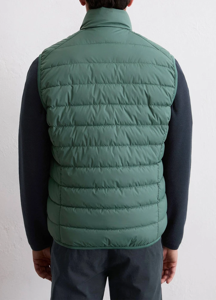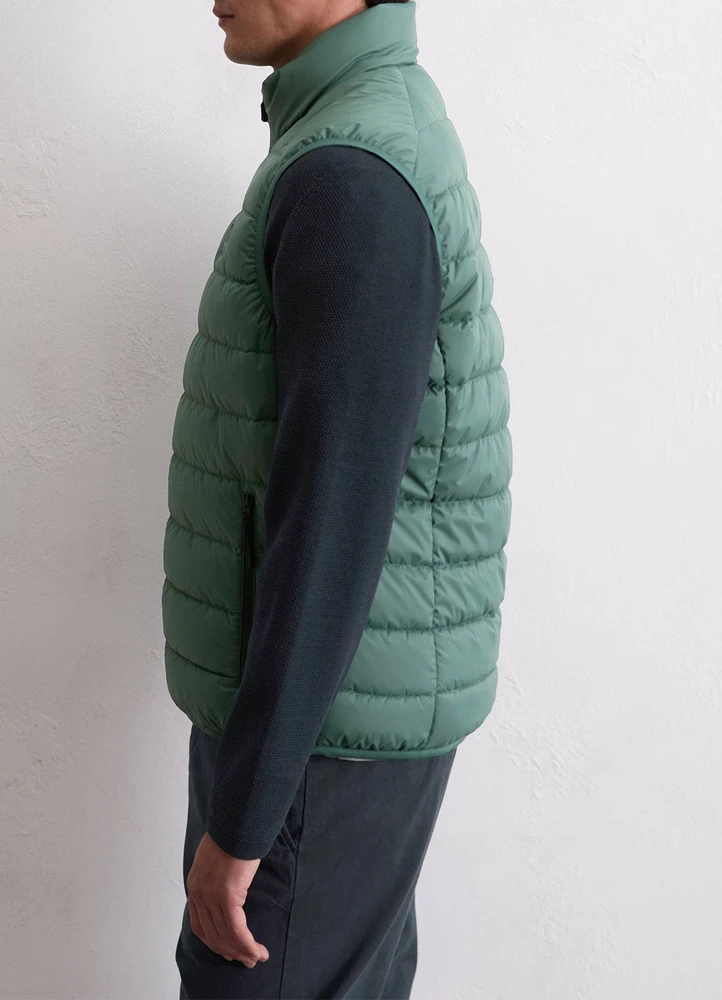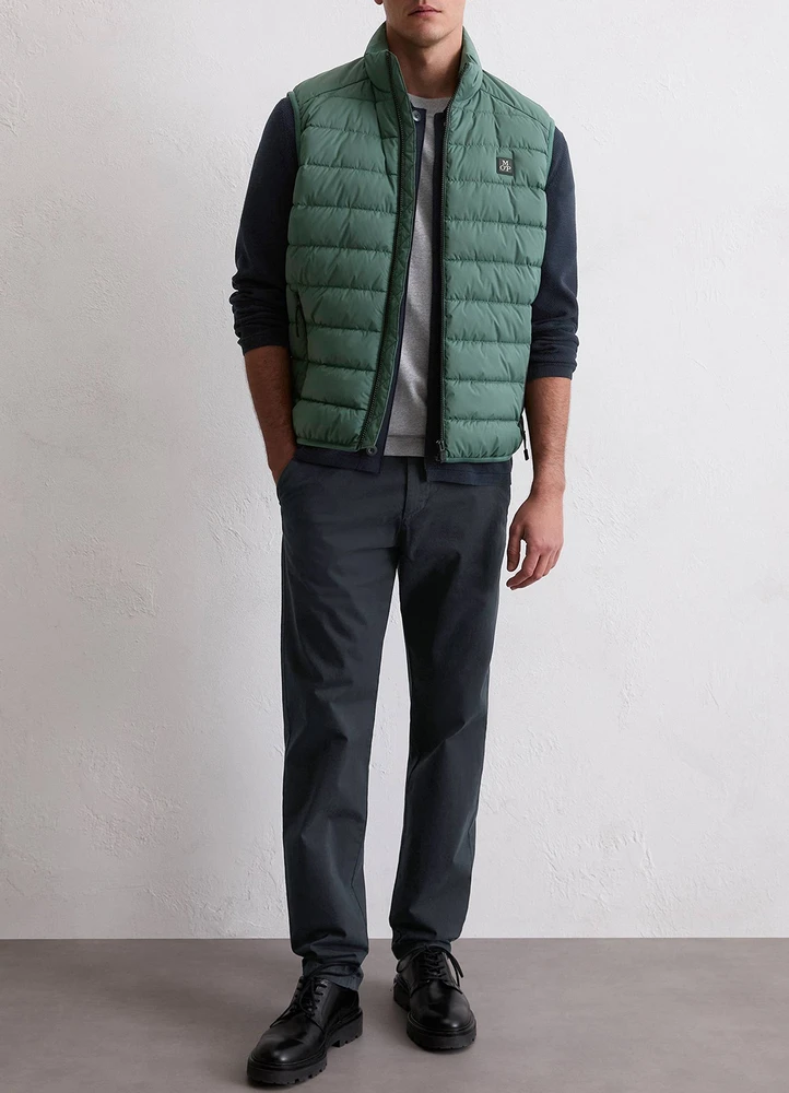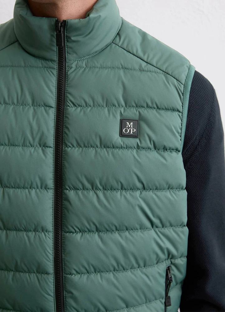 | Vest. Regular quilted vest with practical pannier. Perfect choice for the transitional season: quilted vest with a water-repellent surface made from recycled performance polyester with a micro ripstop structure, stand-up collar and smooth-running two-way zipper. There are two Aquagard zipped pockets on the sides and two large slit pockets on the inside. With elasticated cuffs and straight hem. The warming REPREVE® padding from Unifi Inc. made from recycled PET bottles offers high heat retention, is moisture-resistant and has a soft, springy feel. Special feature: when traveling and hiking, the vest can be packed into the enclosed drawstring bag with drawstring. 100% Polyester. |