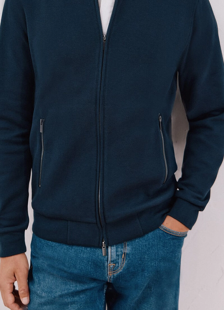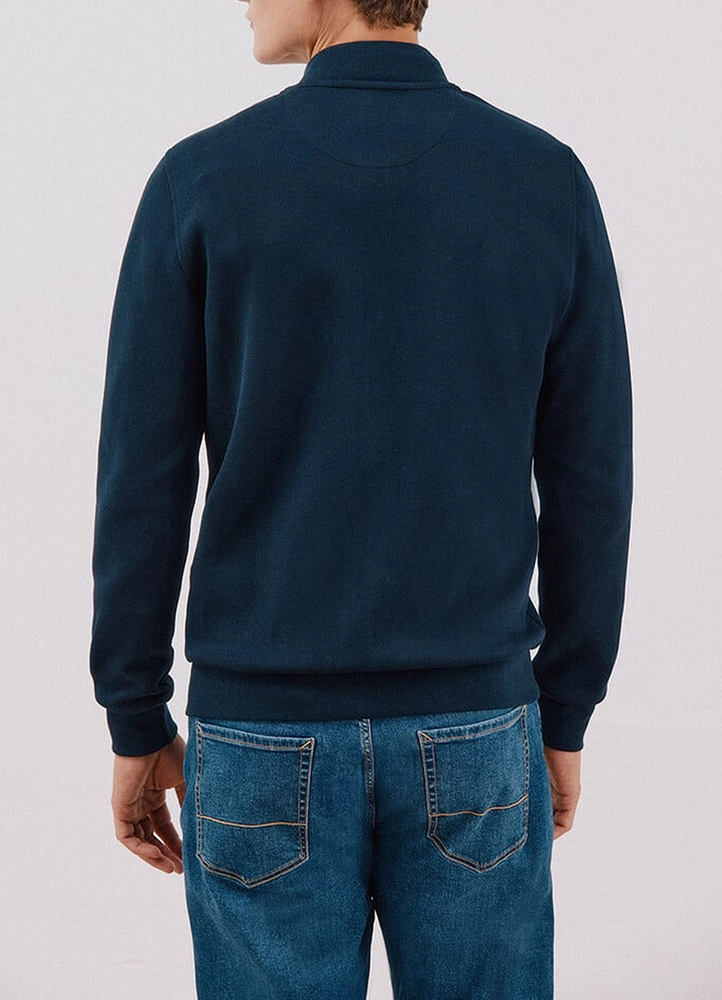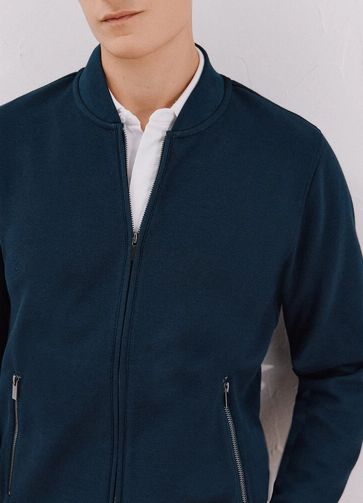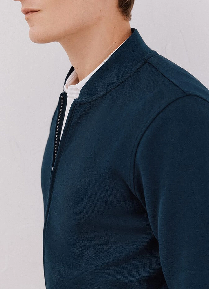 | Bomber Collar Sweatshirt Cardigan. This regular fit jacket comes with a bomber collar, a front zipper, and 2 zippered pockets. By choosing this product, you support our investment in the Better Cotton Initiative, though it is sourced through a mass balance system. 62% cotton, 36% polyester, 2% elastane. |