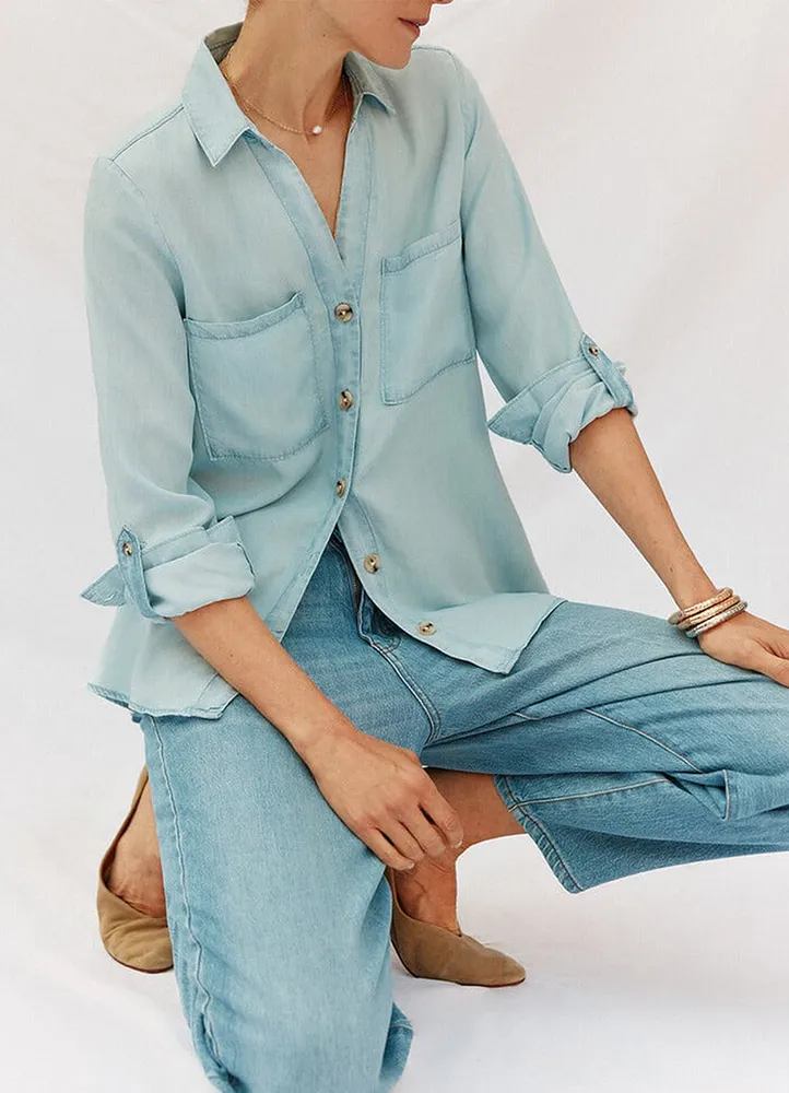 Long sleeve, V-neck, straight fit Tencel Denim shirt featuring two front patch pockets, rolled up sleeves, and buttons closure.