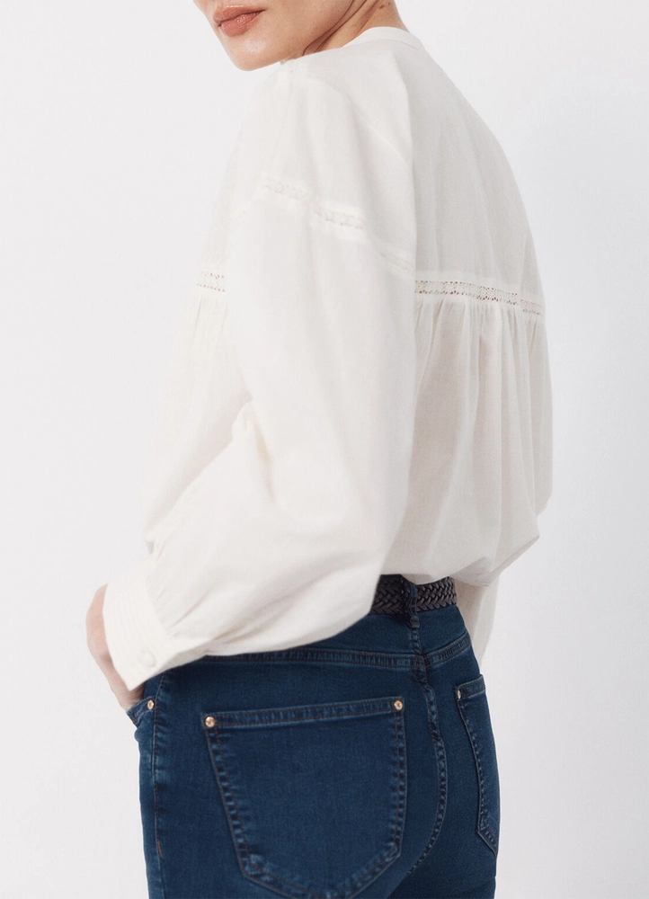 Long sleeve, crew neck blouse with a long sleeves finished at the cuffs, featuring embroidery, lace, and pleats on the front, with a front button closure.
