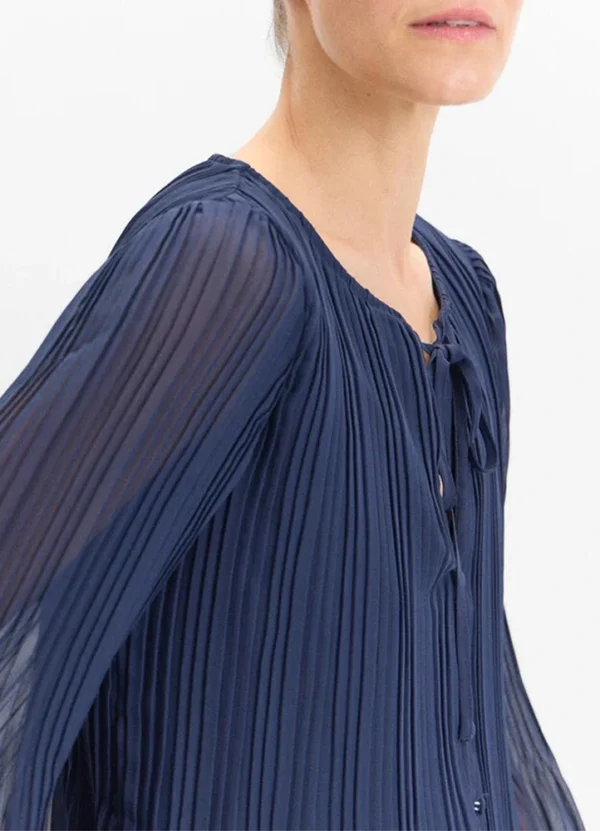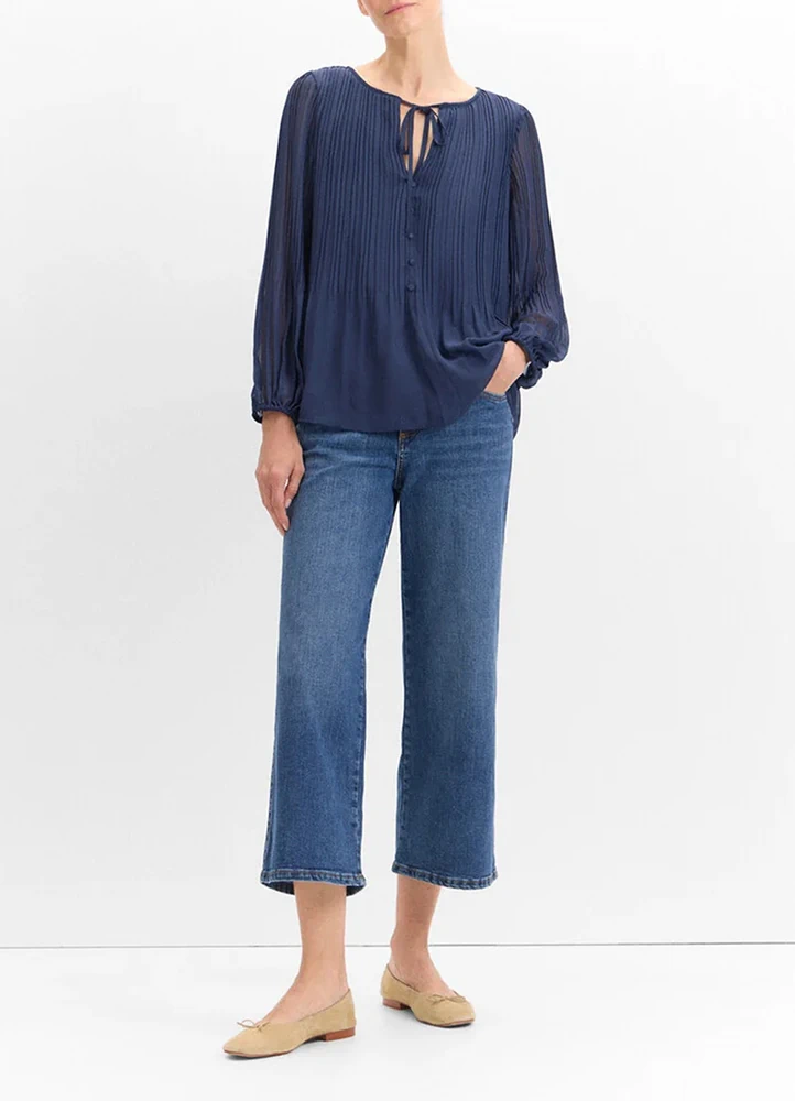 Round neck, loose printed blouse, with front slit up to chest and long gathered sleeves