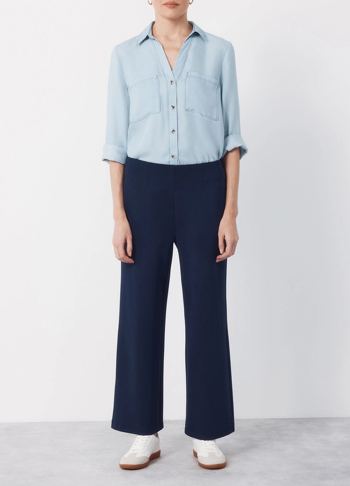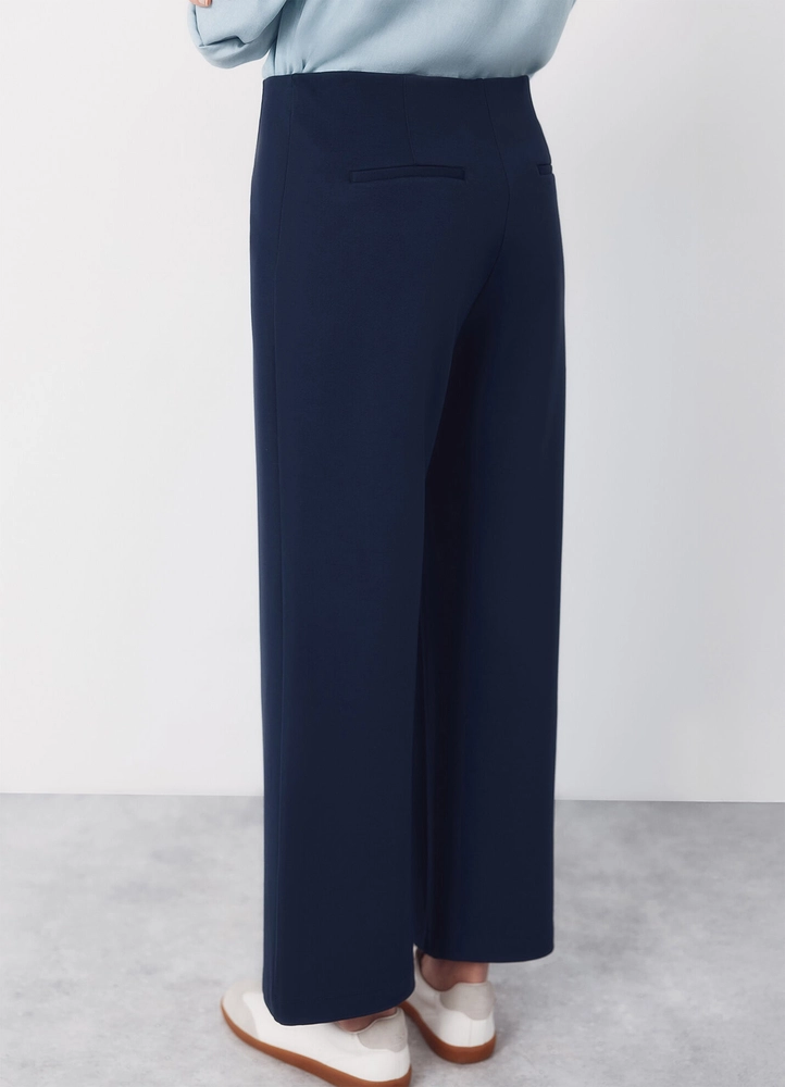 Knit palazzo dress pants with darts at the waist, a wide leg, and no waistband.
