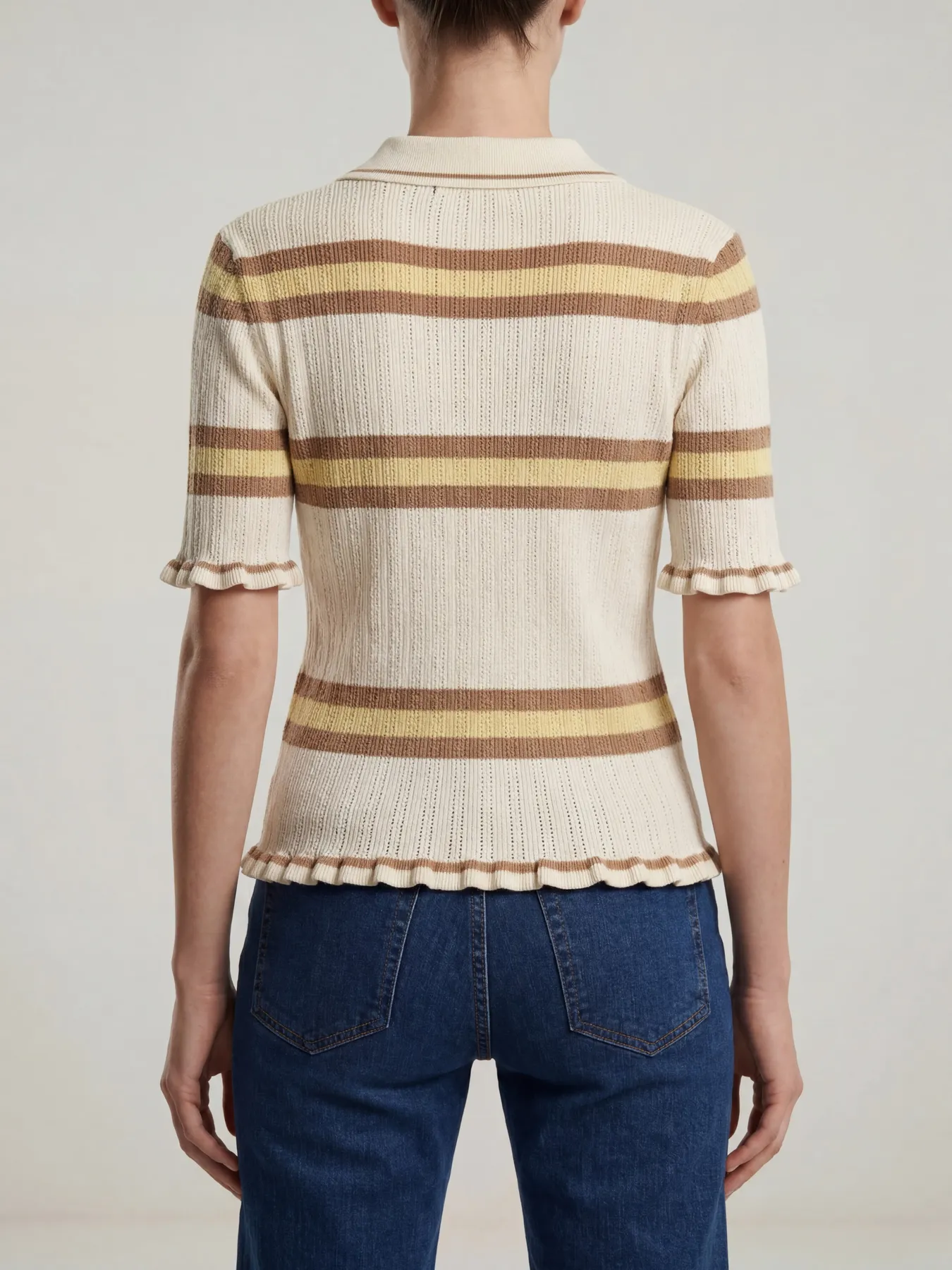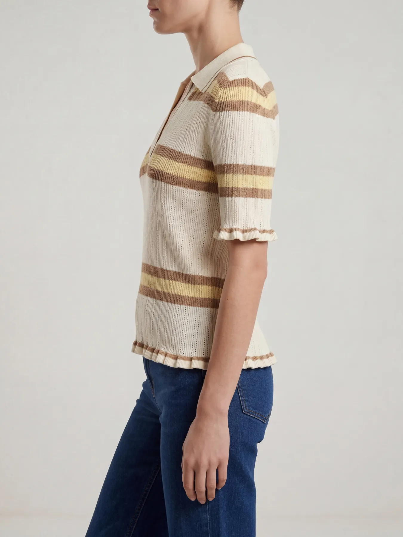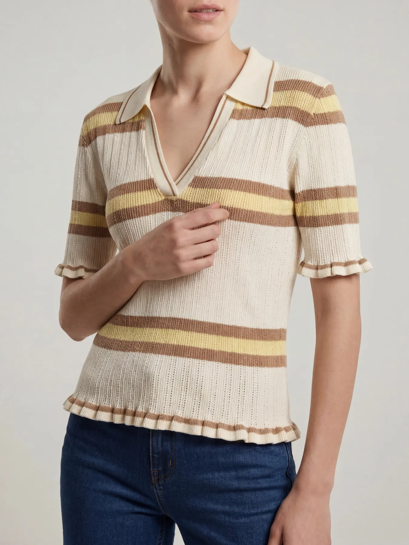 Short sleeve, V-neck, knitted polo shirt with all over stripes, and mini ruffles on the hem and cuffs.