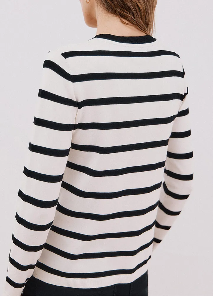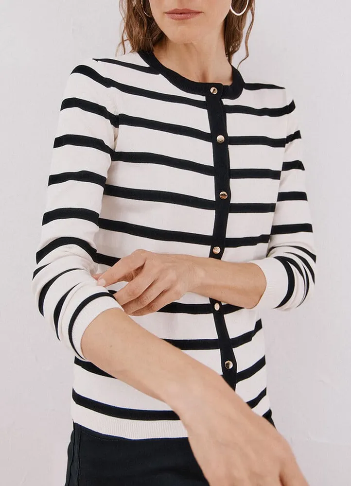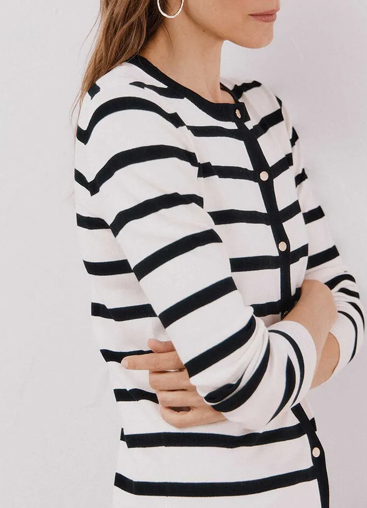 Long sleeve, crew neck knitwear cardigan with all over stripes featuring front metal buttons closure, and ribbed endings.
