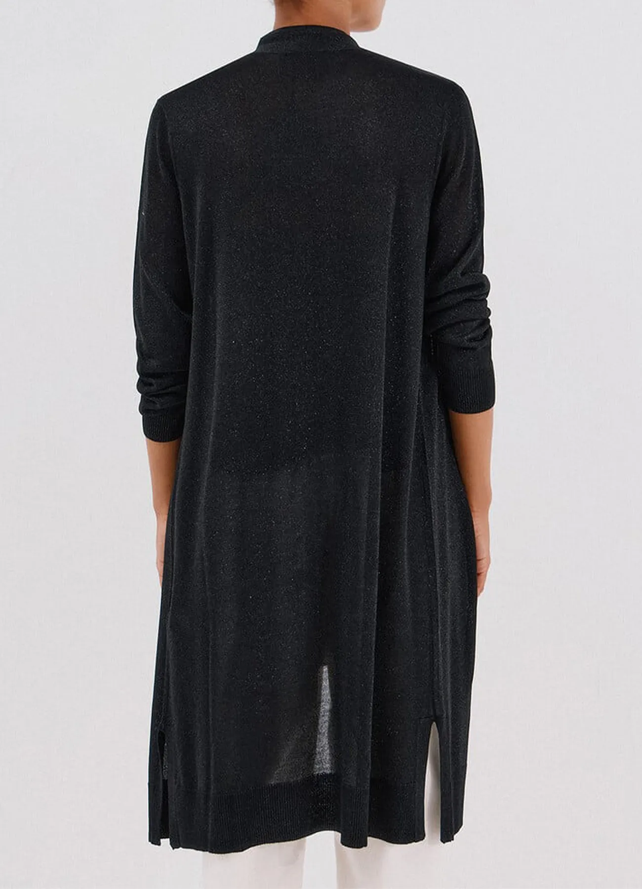 Long sleeve, open, knitwear cardigan with all over lurex details, and ribbed endings.