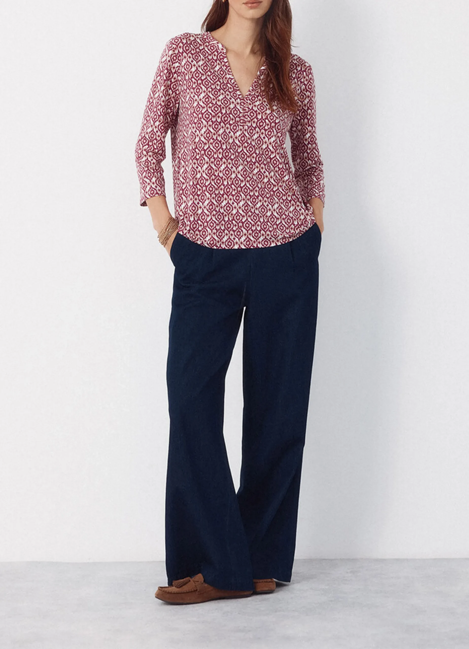 3/4 sleeves, V-neck blouse featuring a mandarin collar with a belied neckline and strap detail, a fluid silhouette, and elastic, comfortable fabric.