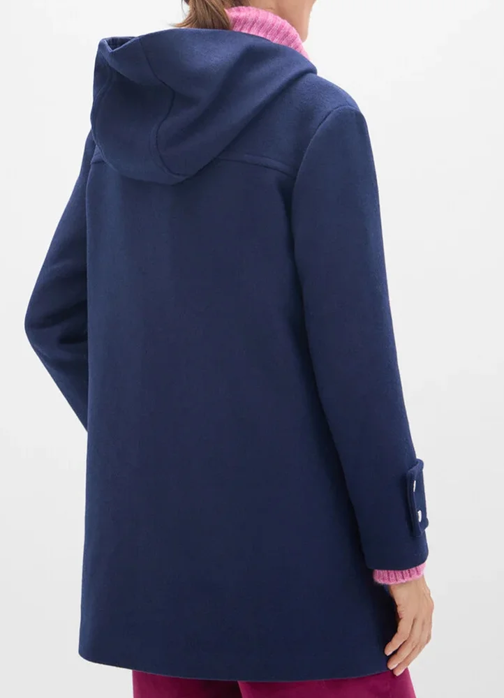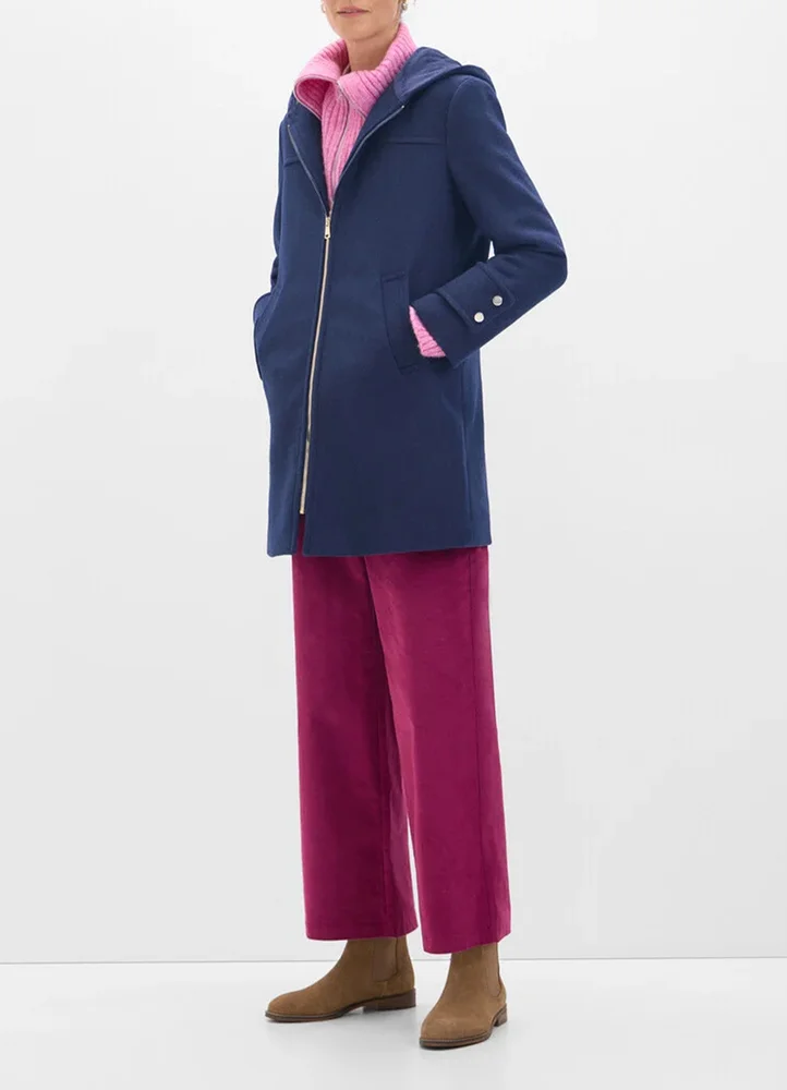 Coat with a hood and central zipper, featuring a slightly flared silhouette, velvet fabric lining on the hood, front welt pockets, and made from a recycled wool blend.