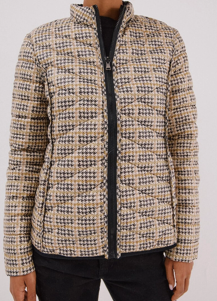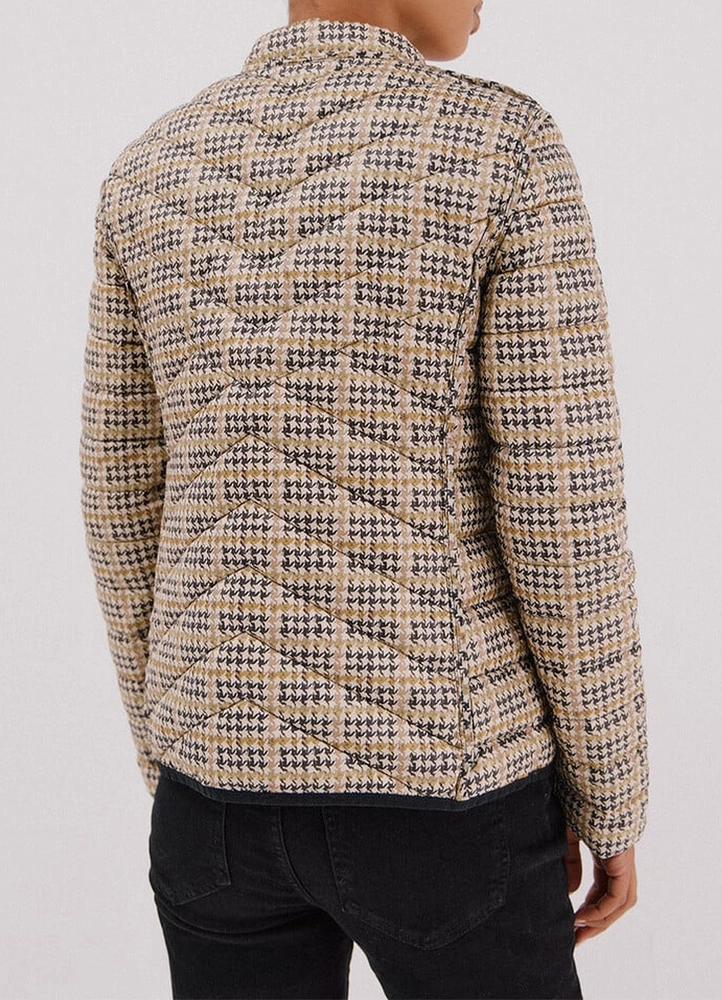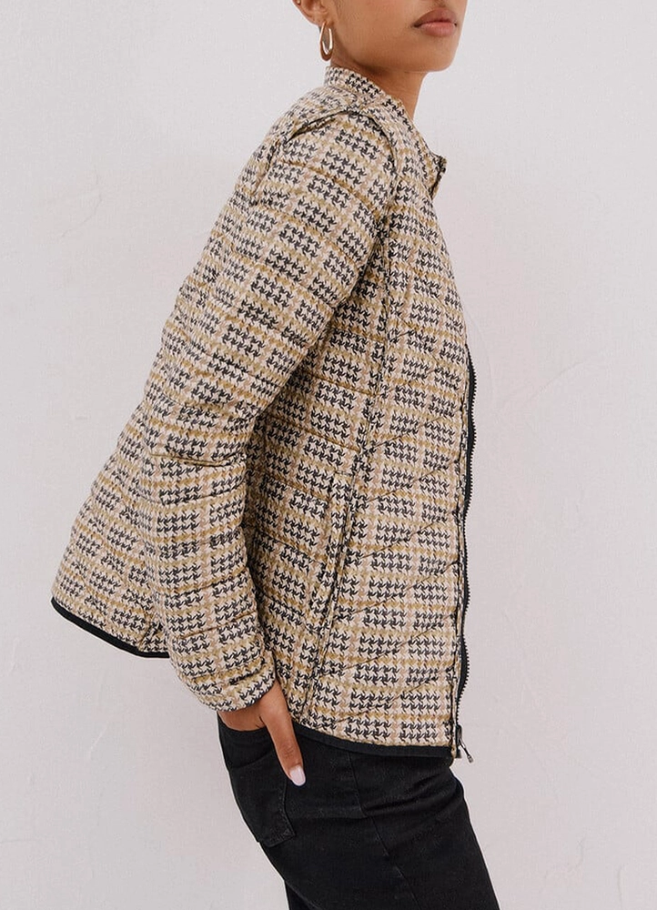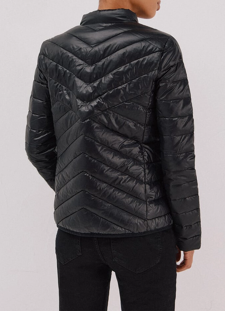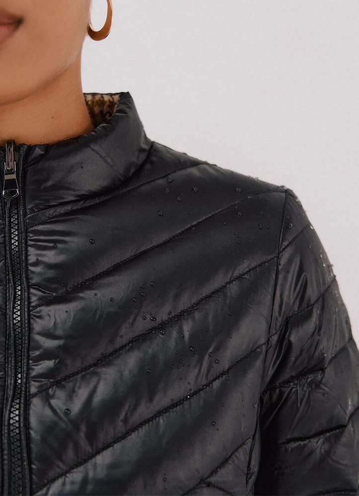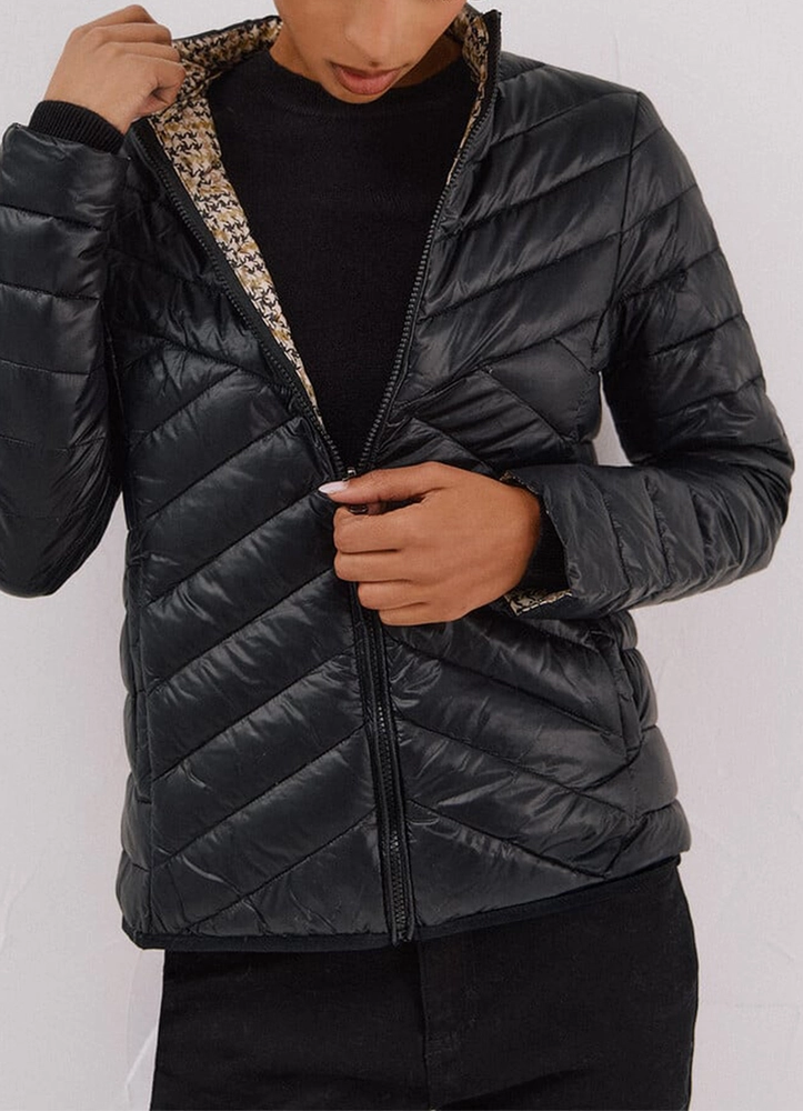 Reversible short jacket with a central zipper and metal puller, featuring welt pockets on both sides and a versatile two-in-one design to combine as you choose.