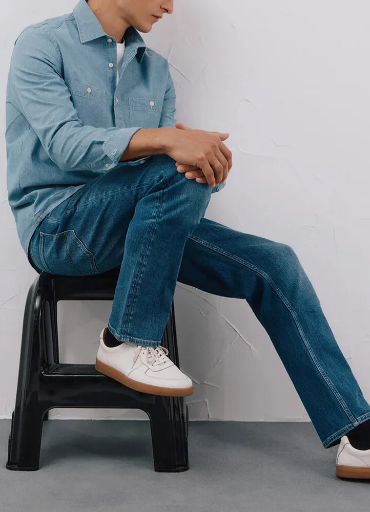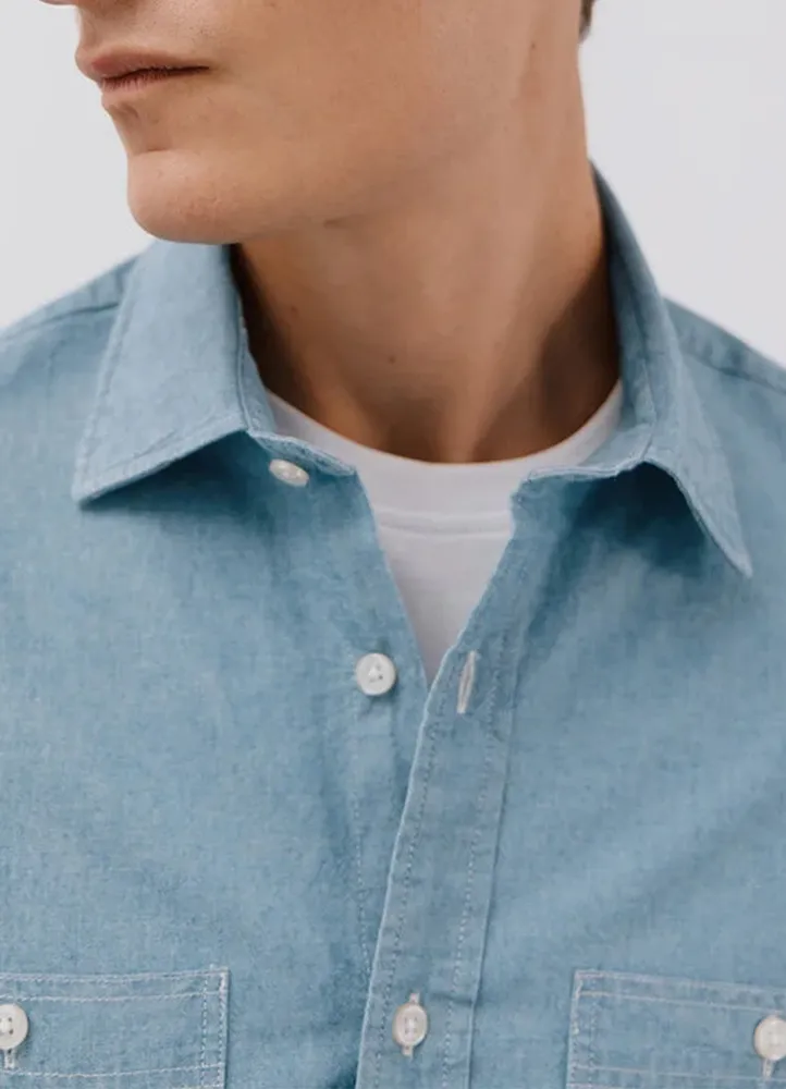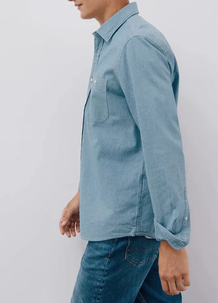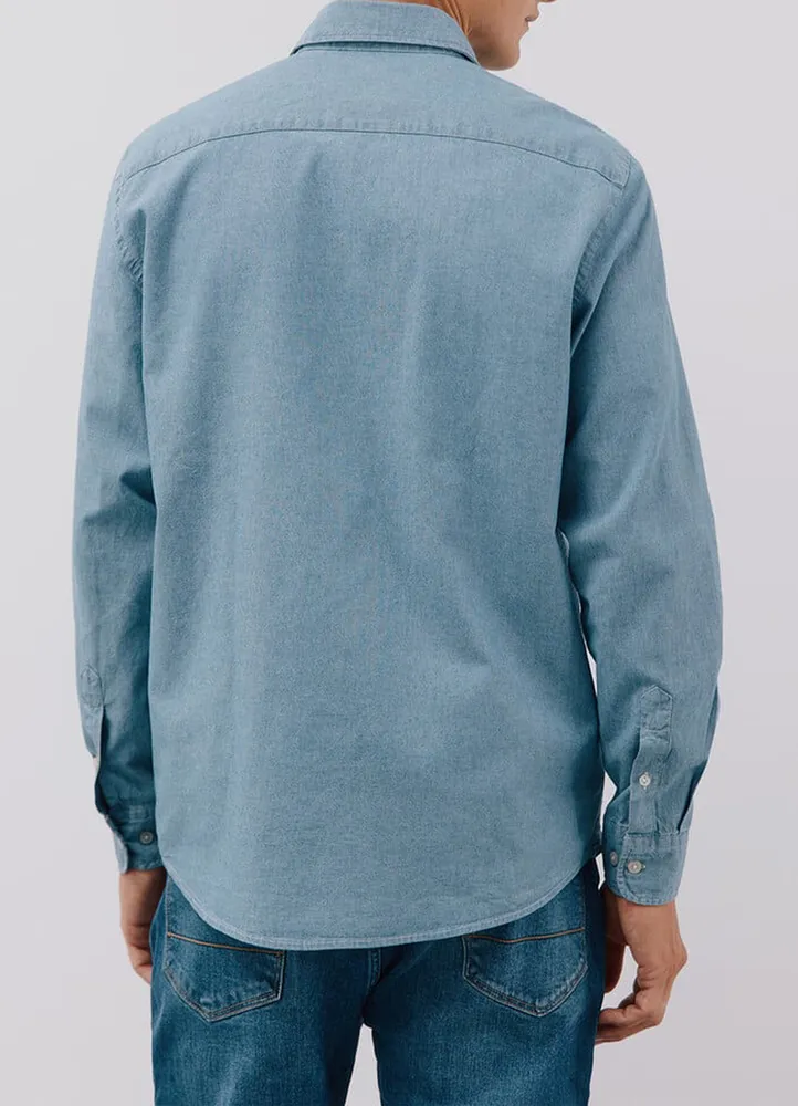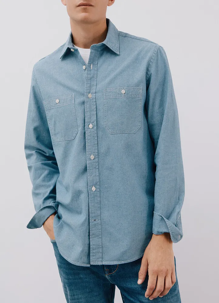 Long sleeve, regular fit denim shirt featuring two buttoned patch chest pockets.