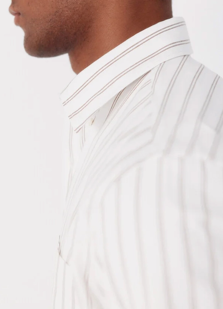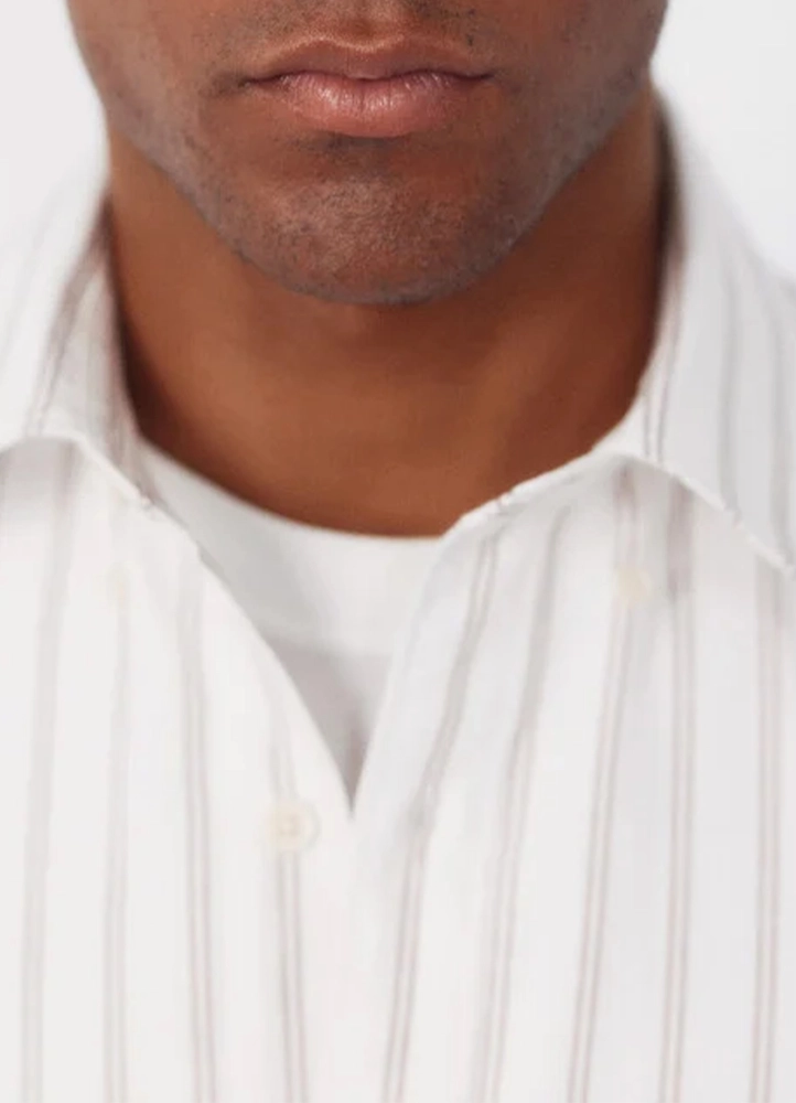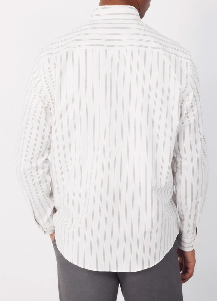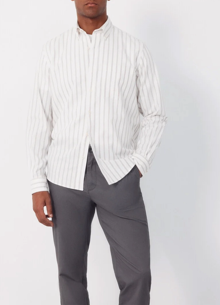 Long sleeve, regular fit, striped shirt crafted from 100% cotton lightweight oxford fabric with slub yarn, featuring a buttoned collar, and a chest pocket.