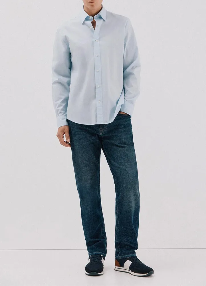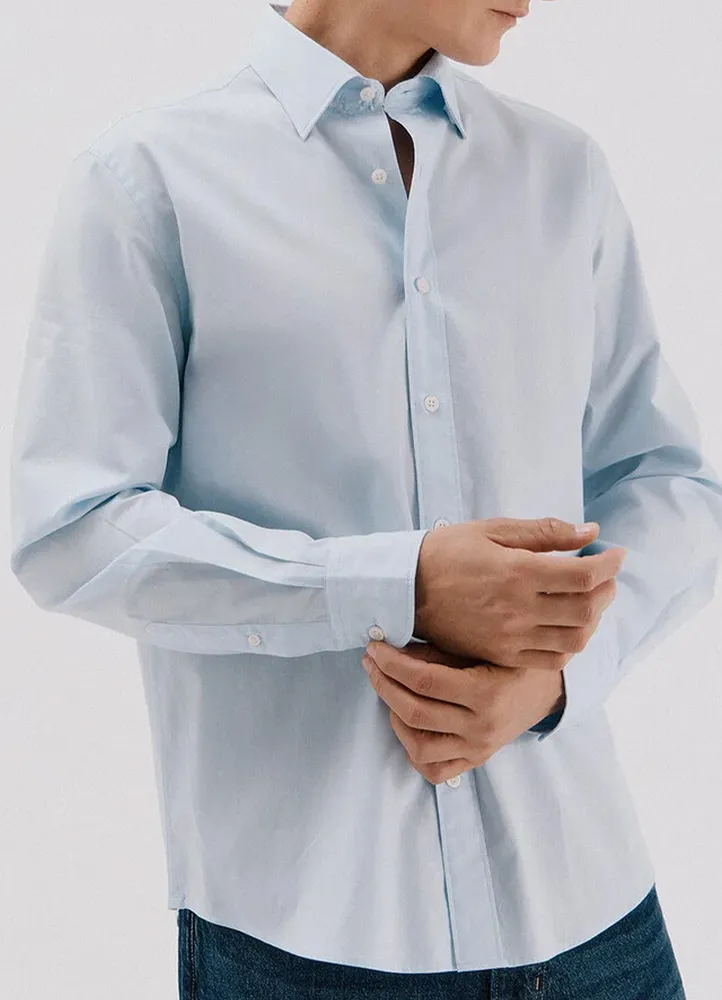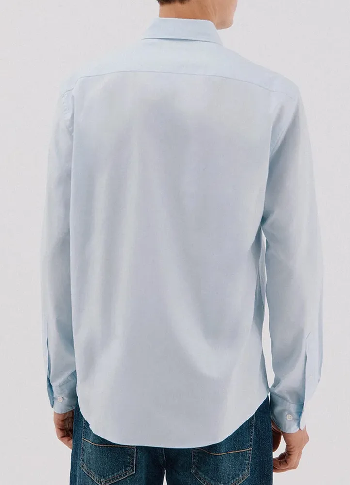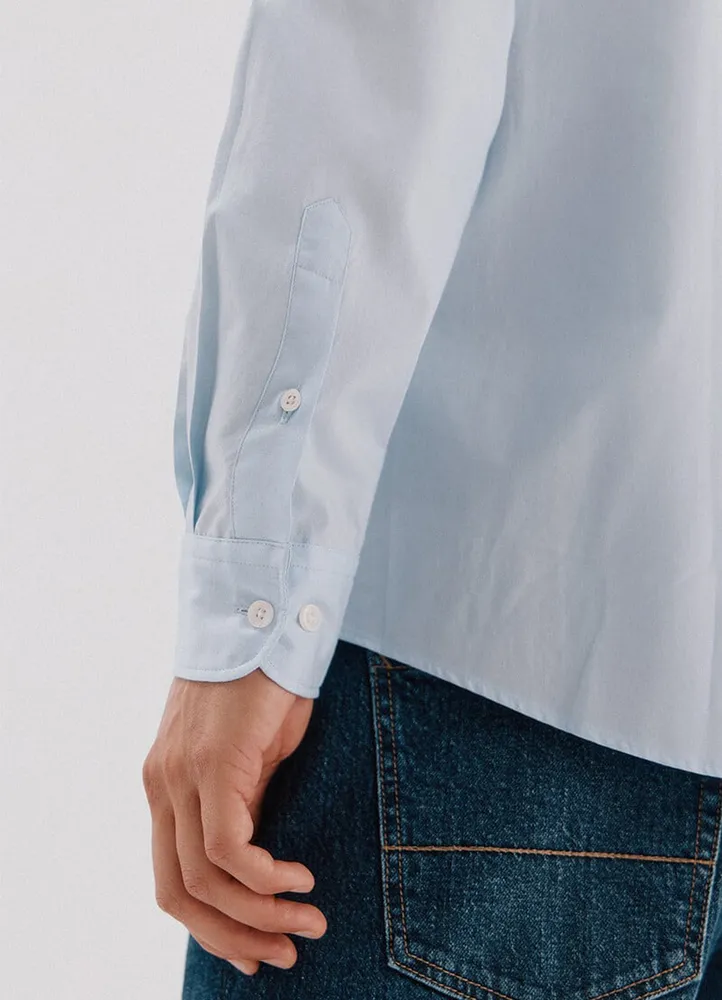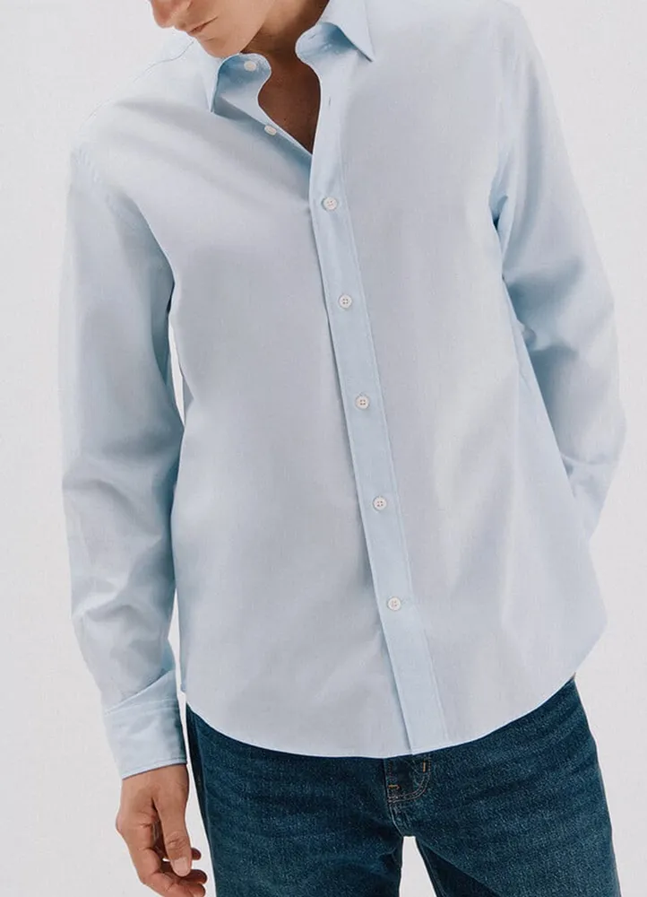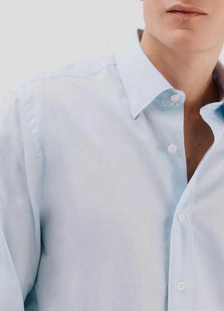 Long sleeve, regular fit, plain shirt featuring a hidden button collar and is crafted from a cotton Tencel blend.