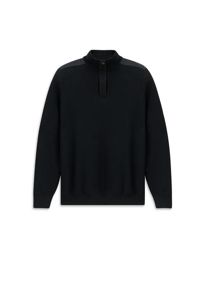 Knitwear.Gauffre knitted hidden half zip sweater with nylon contrast on shoulders.100% Cotton.