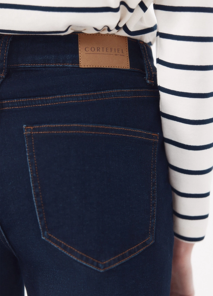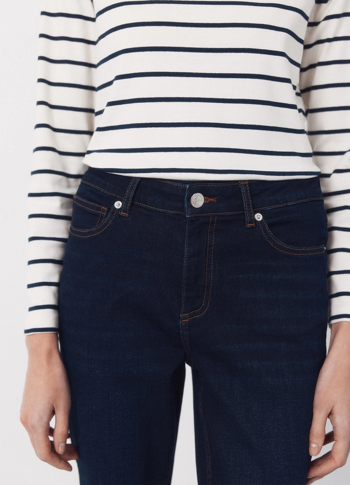 Straight fit, mid waist, 5-pocket jeans made of long crop comfort fabric with a hidden zipper closure under a flap, personalized trimmings, and belt loops.