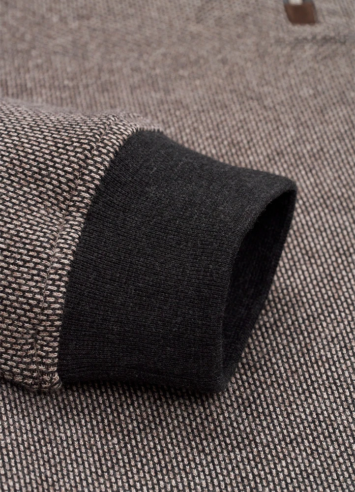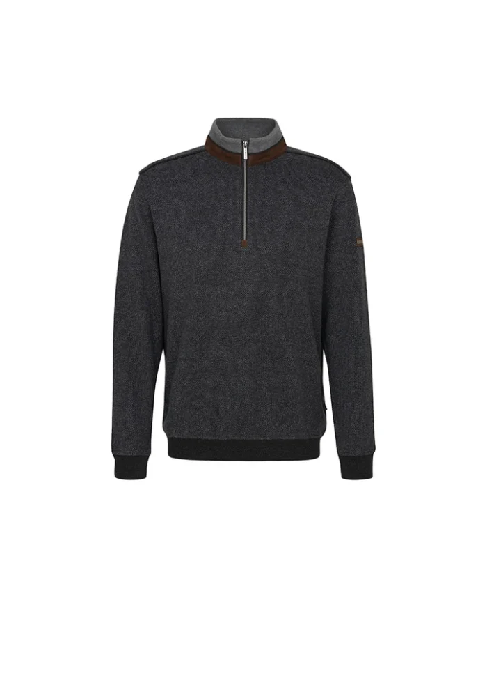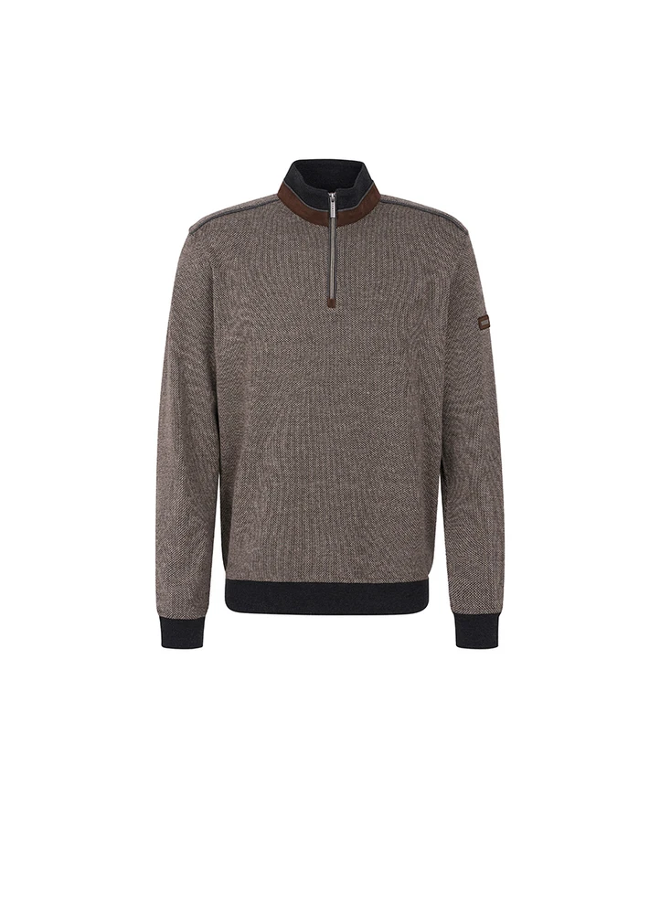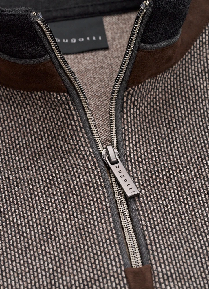 Jaquard half zip sweatshirt with metal bugatti logo on arm and suede brown contrast.